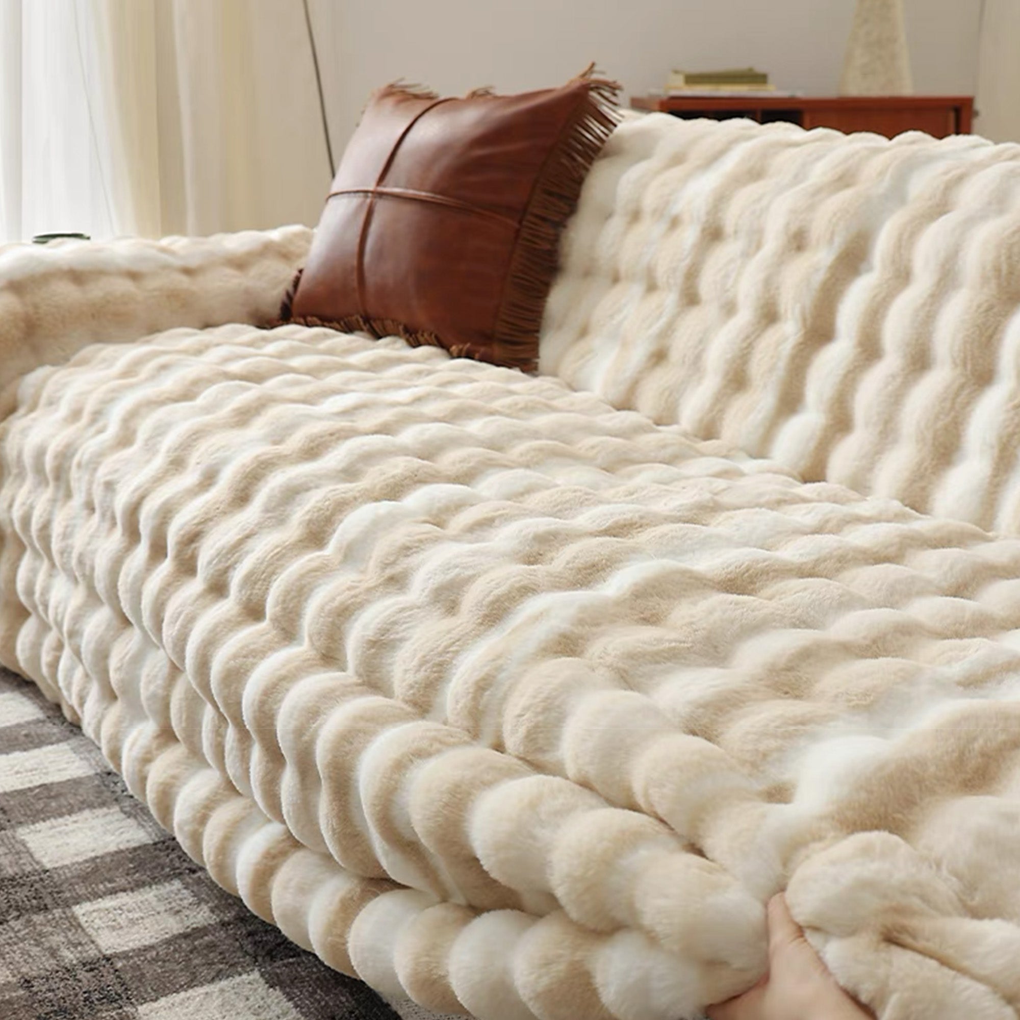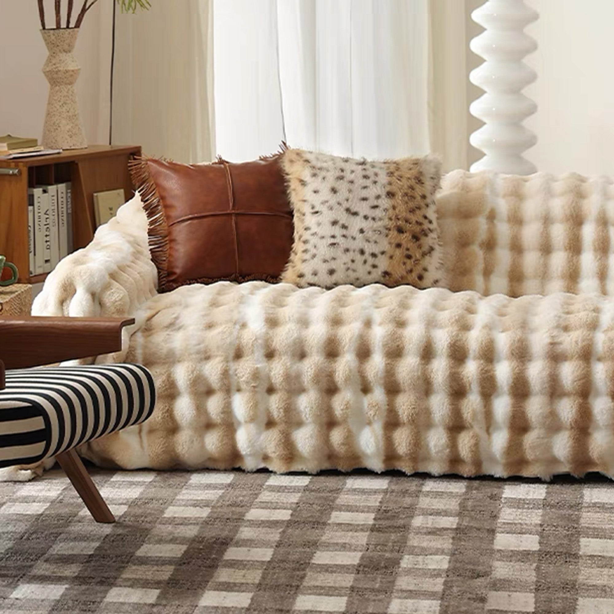 Ge ditt vardagsrum en touch av lyx med detta sofföverdrag i fuskpäls. Med sin mjuka, plyschiga textur och varma, naturliga toner lyfter överdraget inte bara stilen på din soffa utan ger också en mysig och inbjudande känsla. Det subtila schackrutmönstret ger djup och gör det till en fantastisk blickfångare i alla rum.