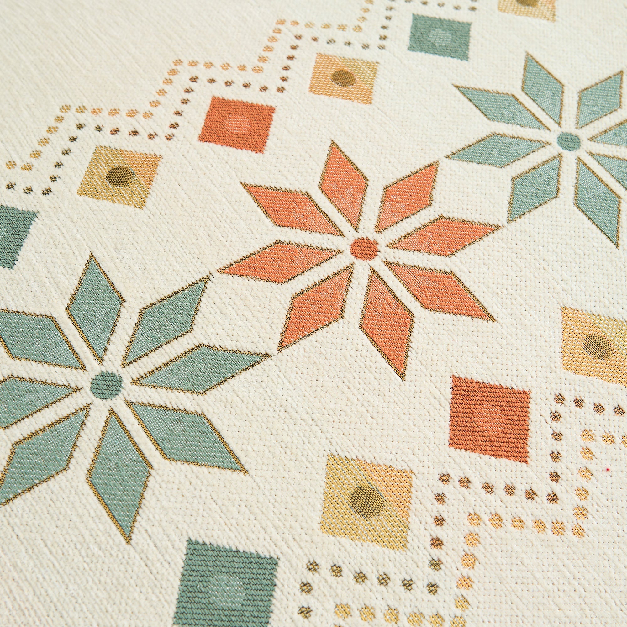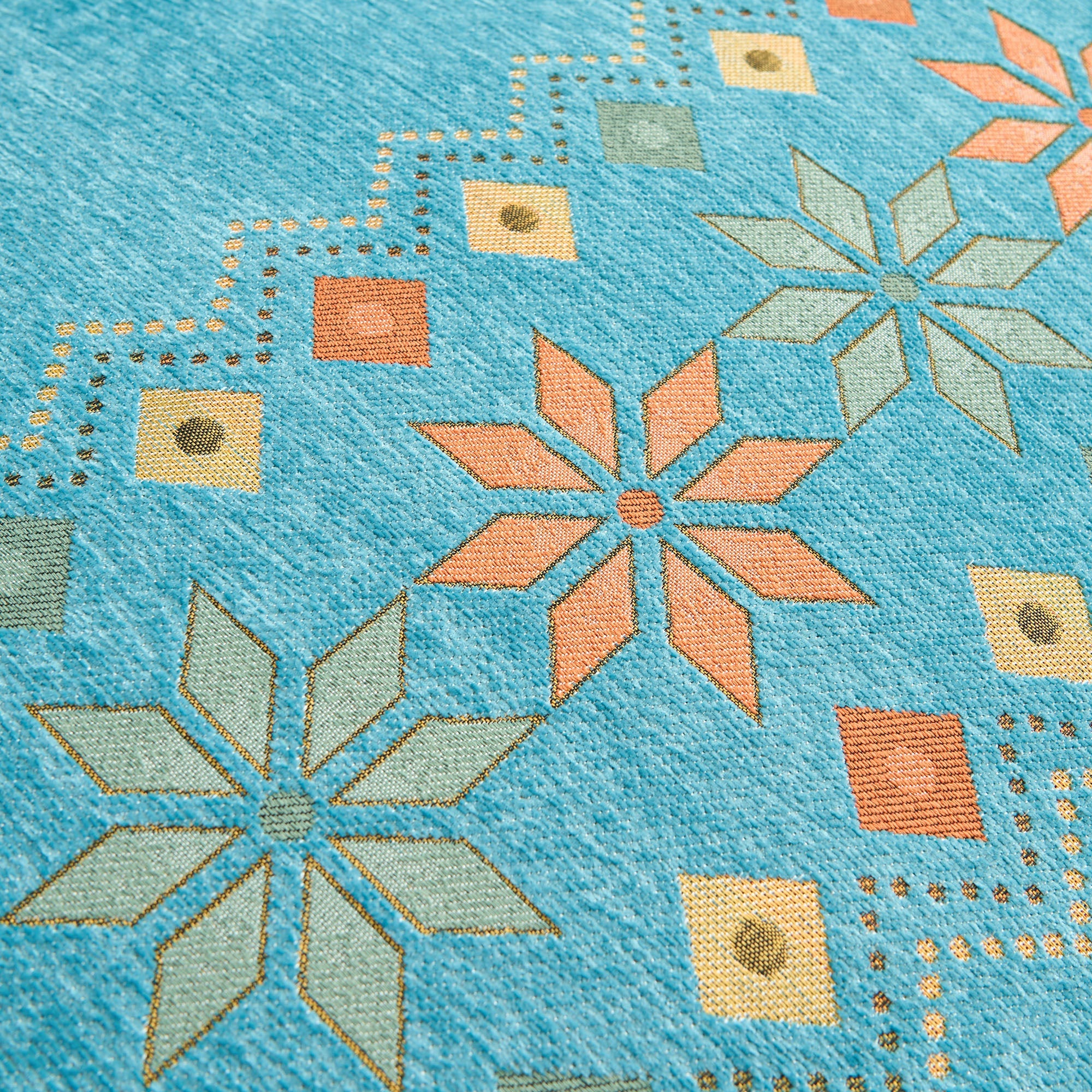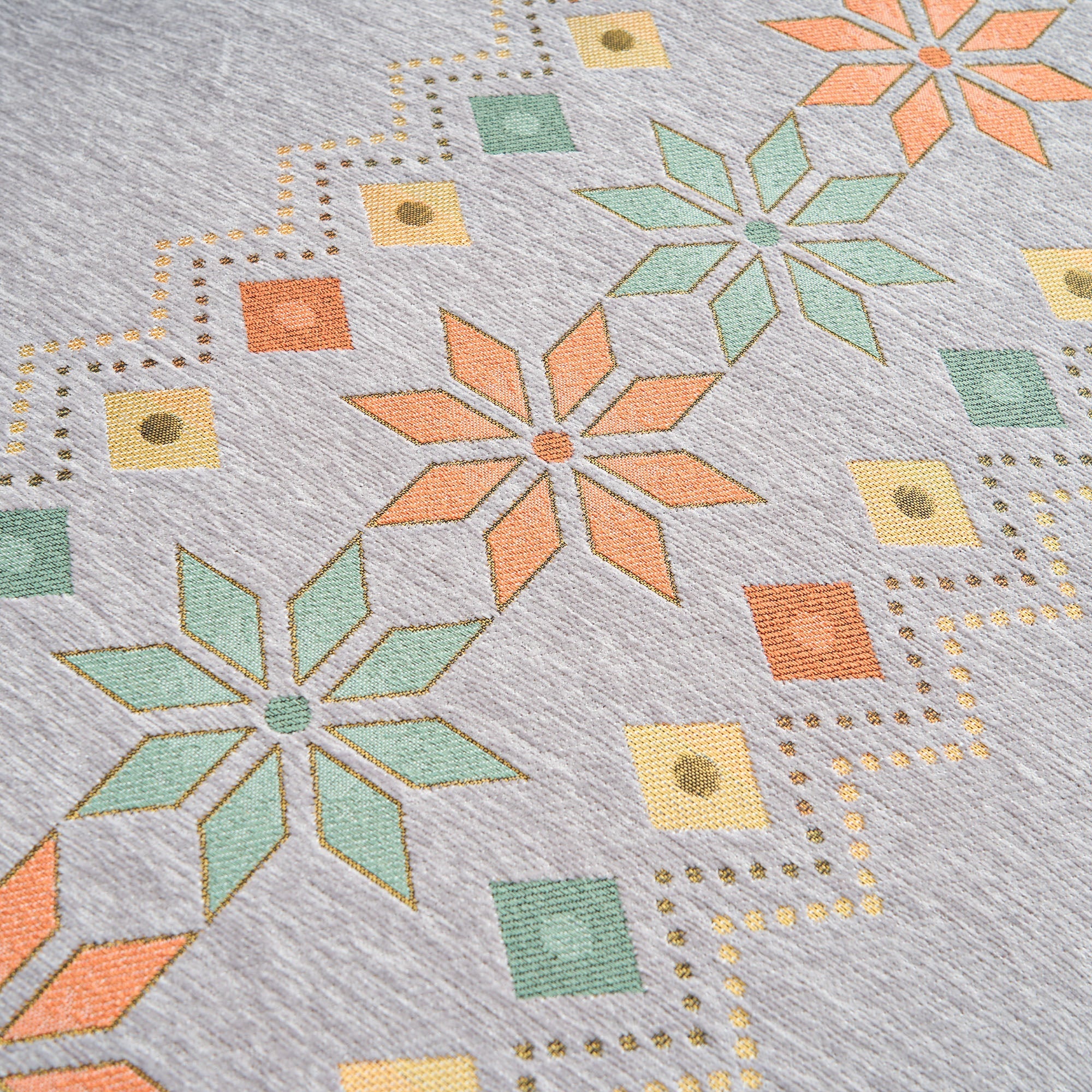 •Ljus geometrisk design: Med ett färgglatt nordiskt inspirerat geometriskt mönster som lyfter din inredning med en trendig, konstnärlig känsla.