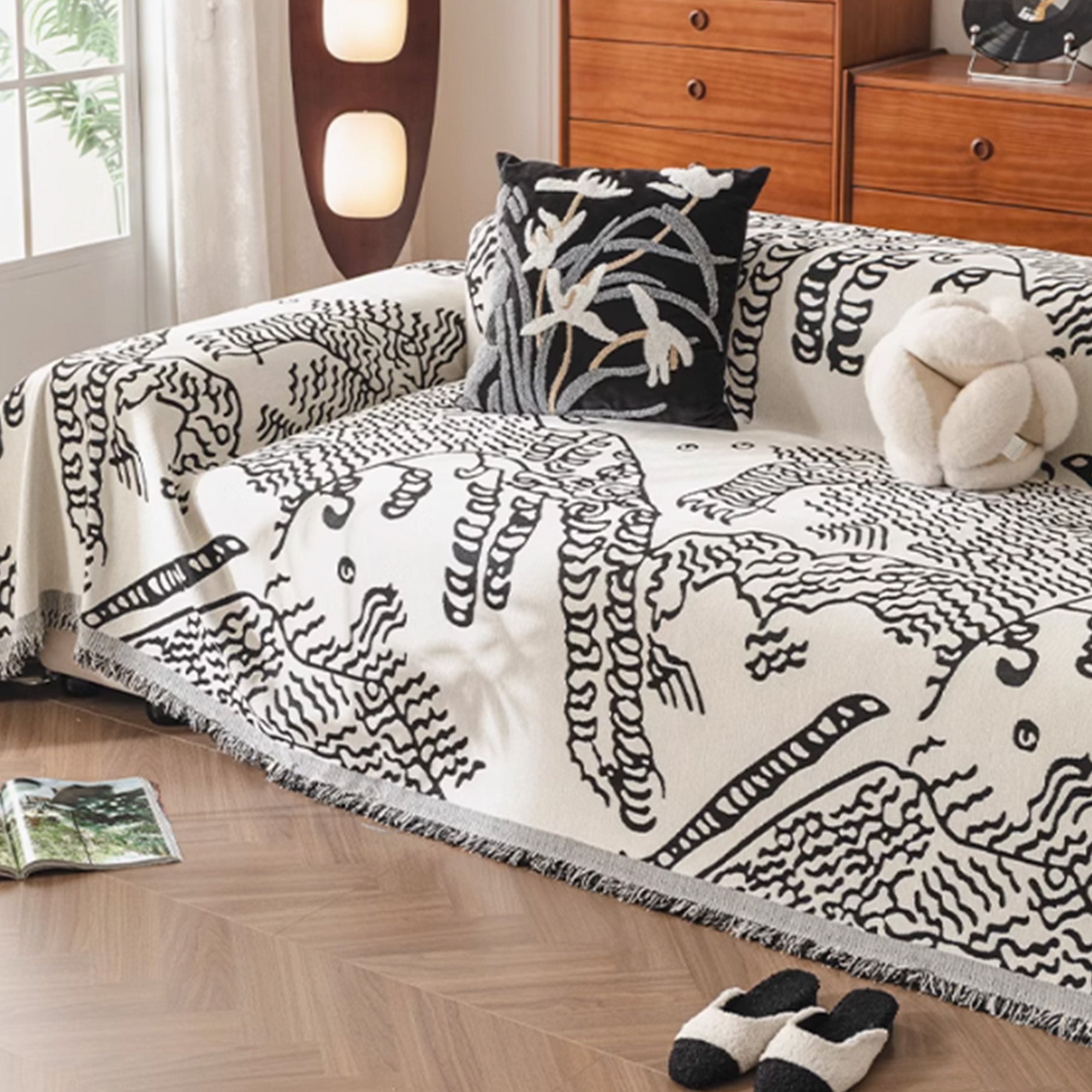 Ge ditt hem en touch av konstnärlig elegans med sofföverdraget Nature Sketch. Detta filtliknande överdrag är tillverkat av ett premiumvävt tyg med ett intrikat naturinspirerat mönster som ger en lugn, handritad känsla till alla utrymmen. Mjukt men ändå slitstarkt, perfekt för att mysa under kyliga kvällar eller som ett elegant lager till soffan eller sängen. Dess dubbelsidiga design gör att du kan vända det för en fräsch look, vilket gör det till ett mångsidigt tillskott till din inredning.