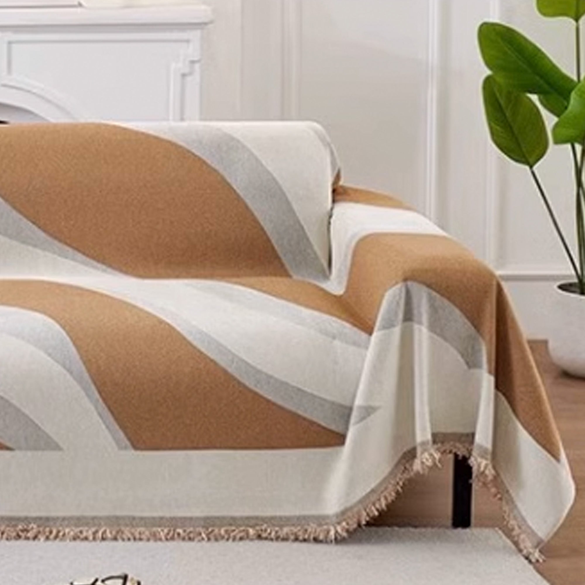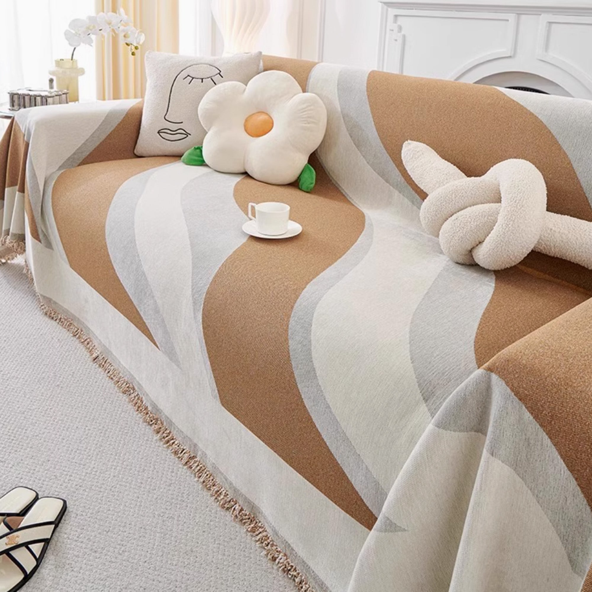 Sofföverdraget ger ditt vardagsrum en modern och elegant estetik. Med sina rena linjer och balanserade färgschema ger detta sofistikering och stil samtidigt som det skyddar dina möbler. Den släta texturen och färgblocksdesignen gör det till ett mångsidigt och elegant tillskott till alla utrymmen.