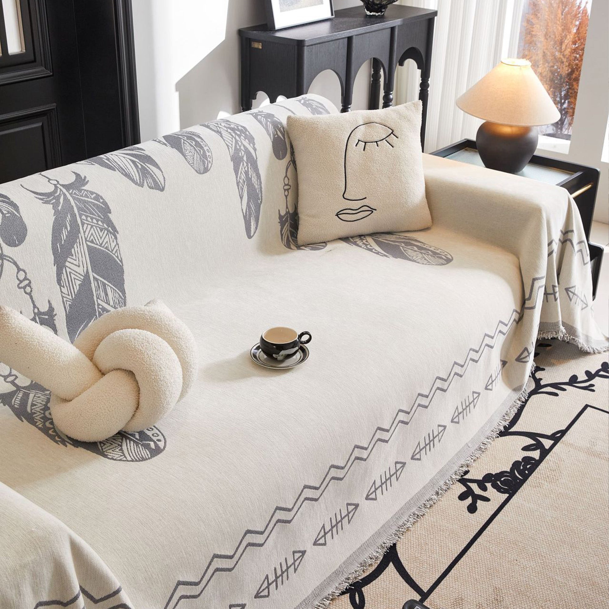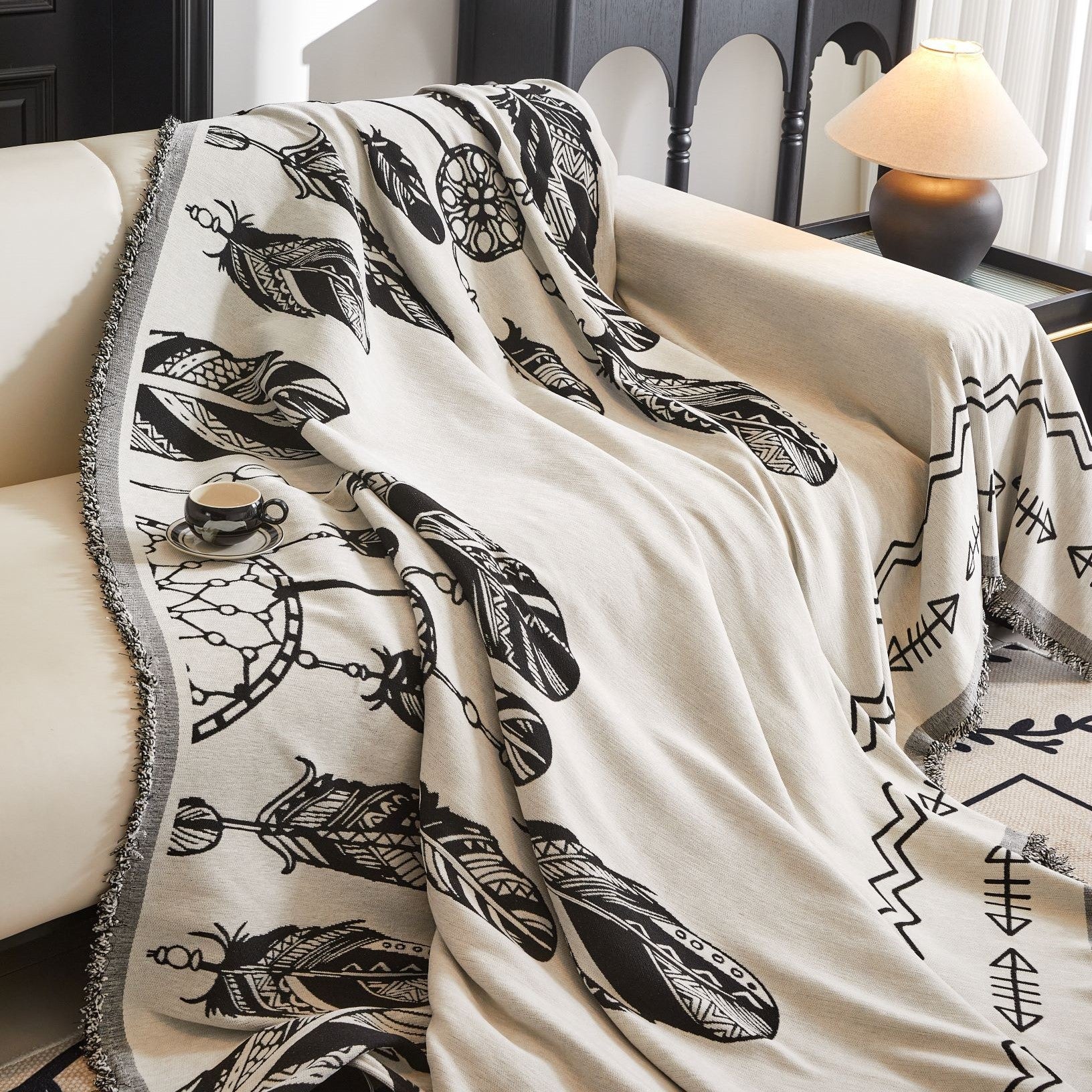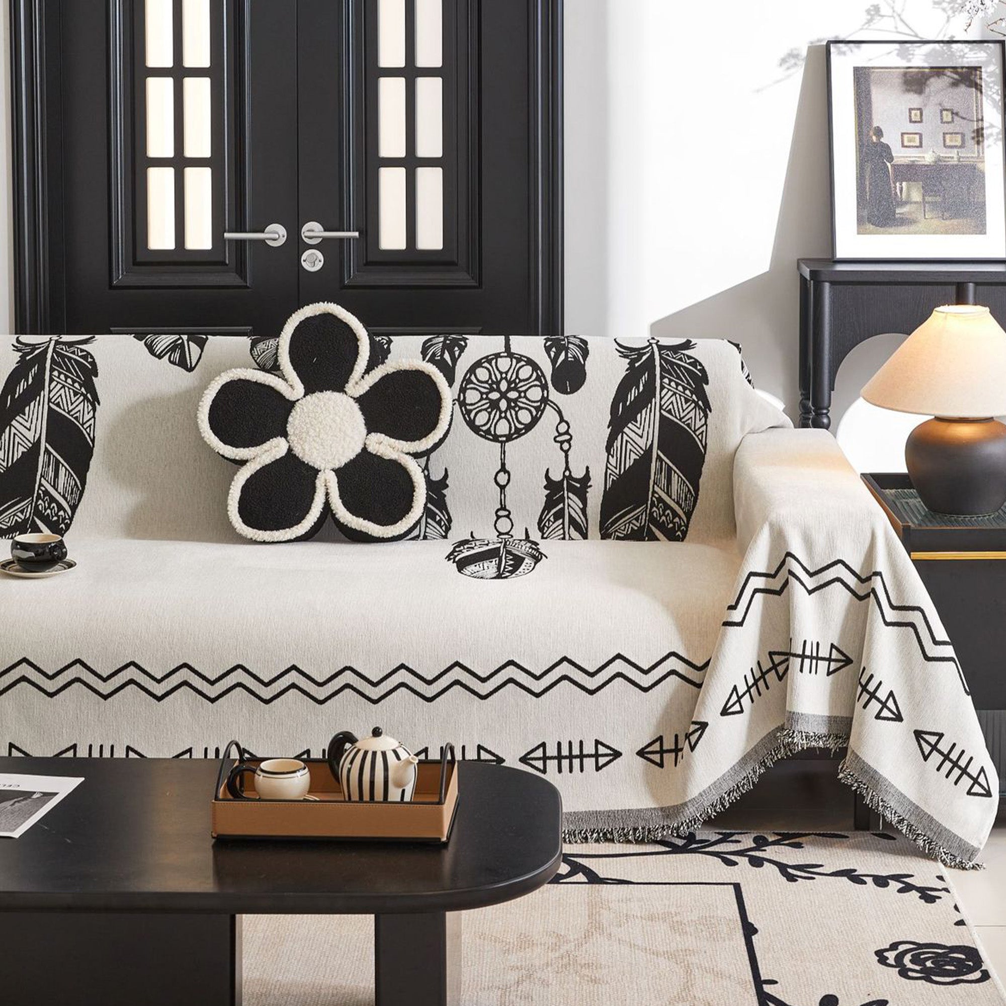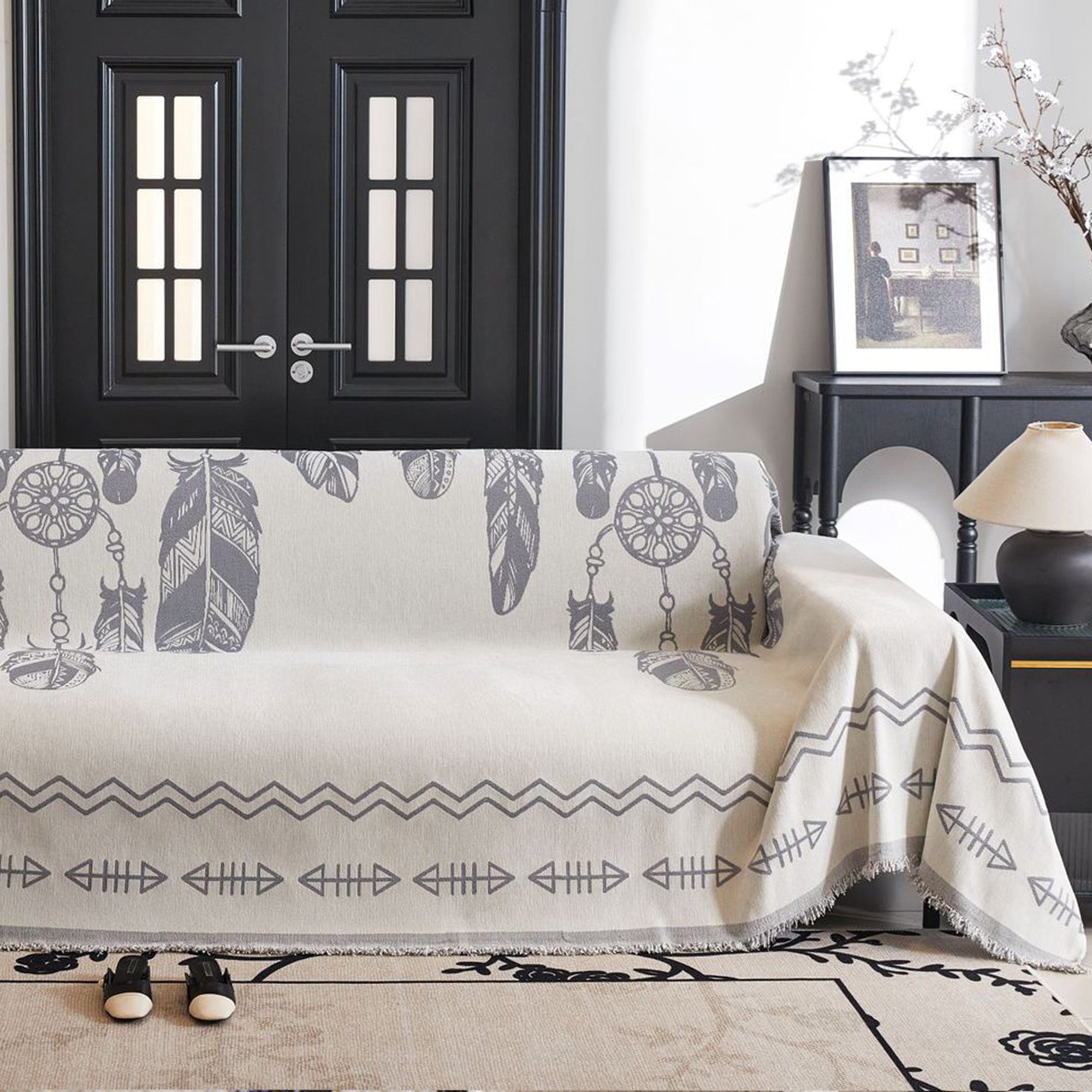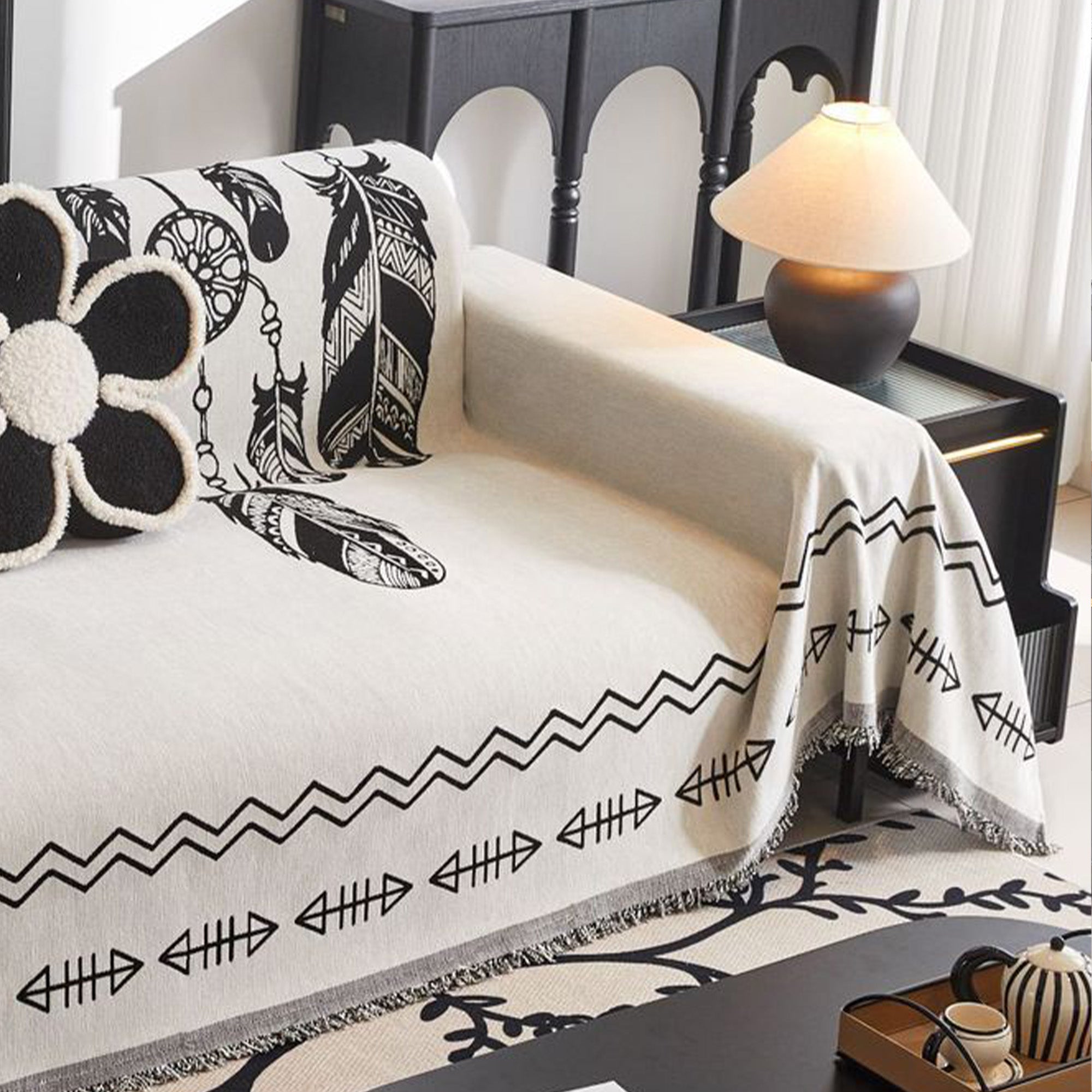 Förhöj din vardagsrums estetik med detta drömfångarinspirerade sofföverdrag. Med en djärv och invecklad svartvit fjäder- och pildesign kombinerar detta överdrag modern bohemisk charm med funktionellt skydd för din soffa. Perfekt för att skapa en unik och inbjudande atmosfär i ditt hem.