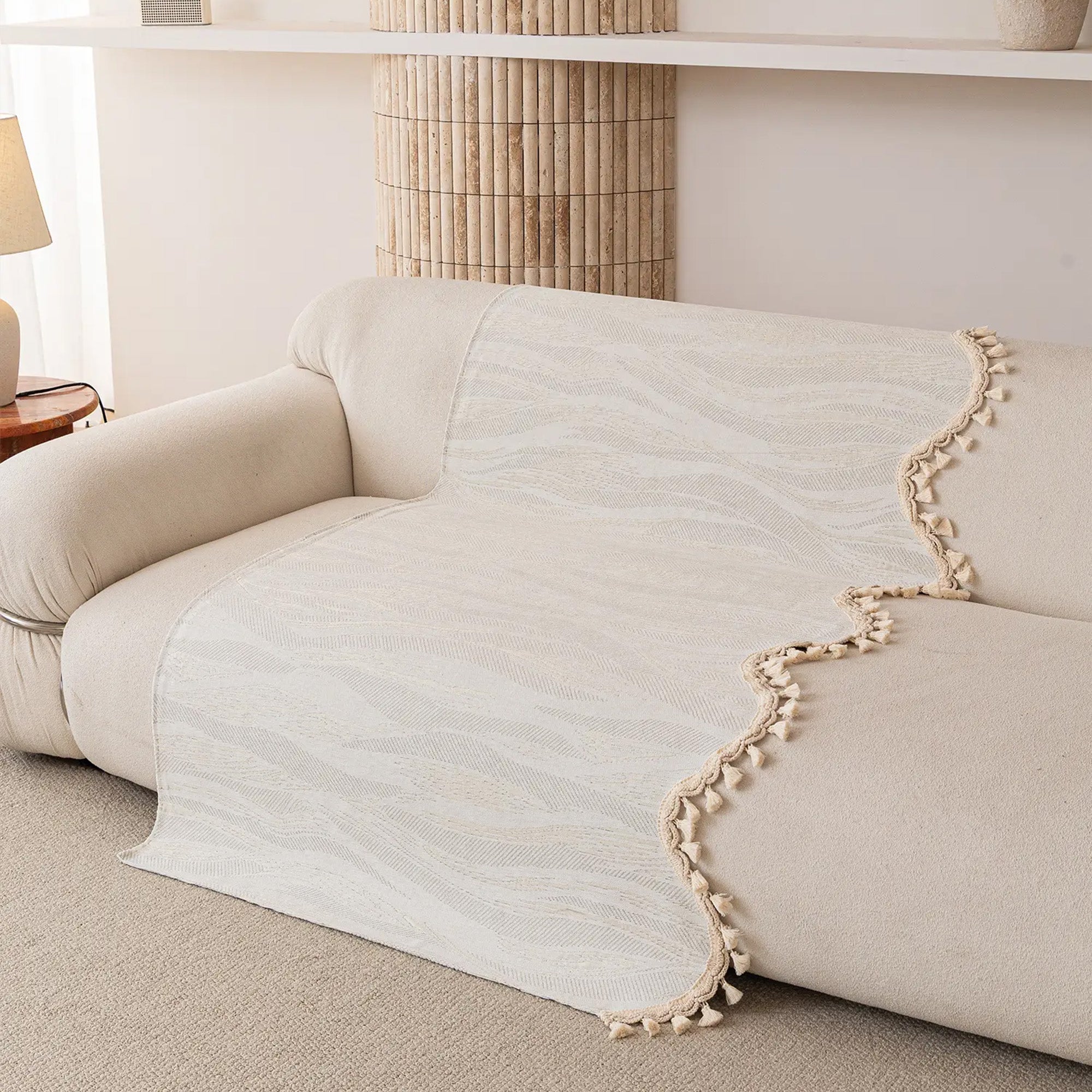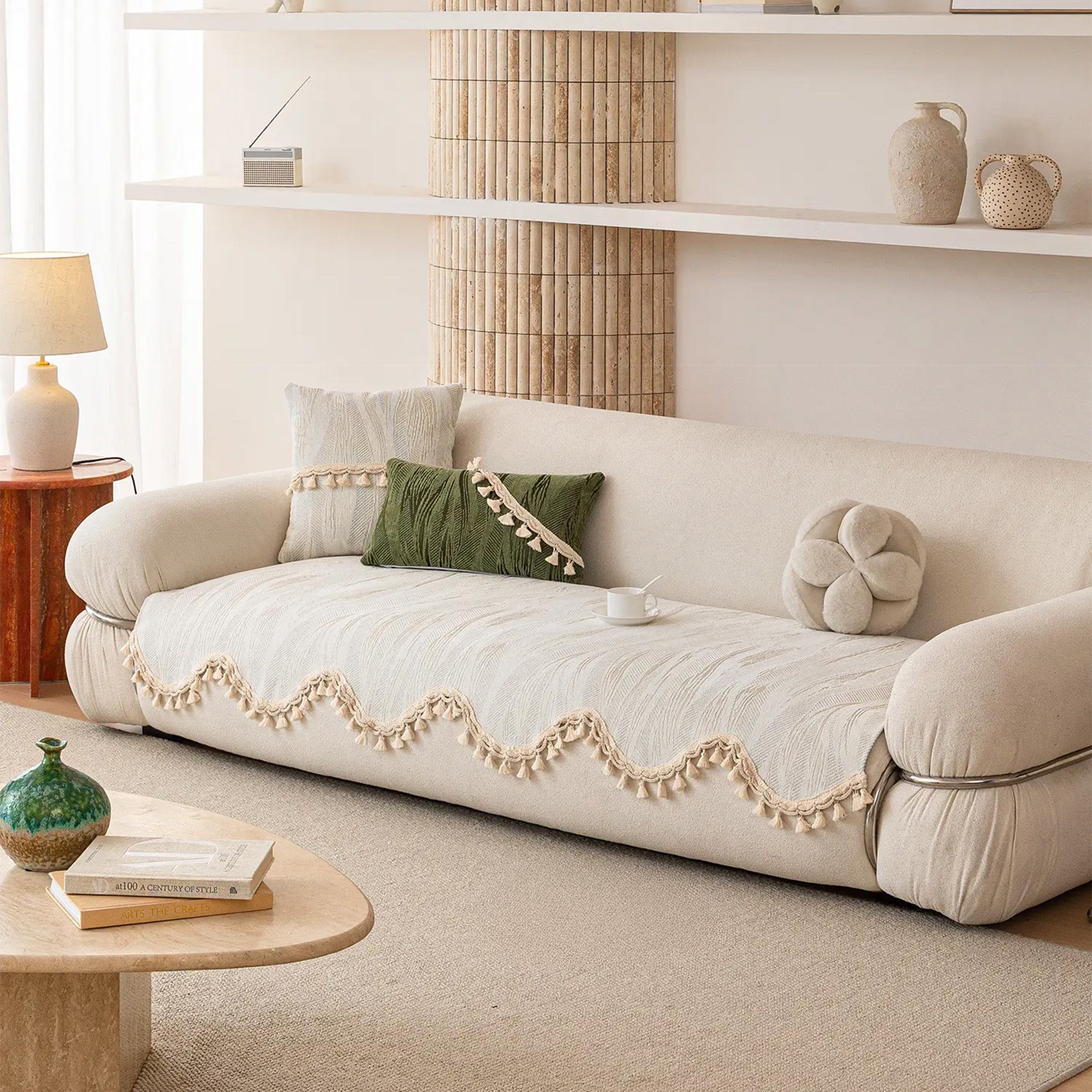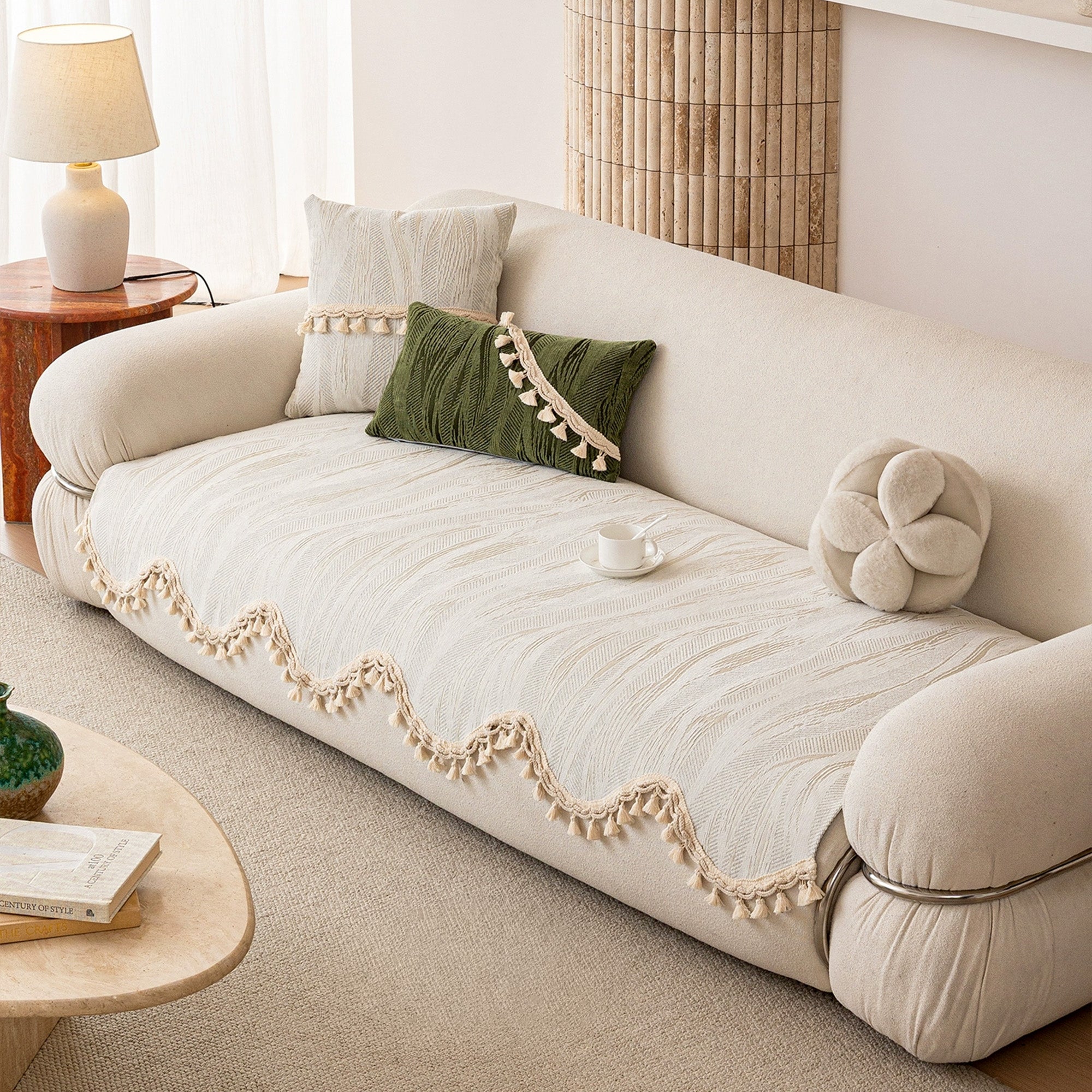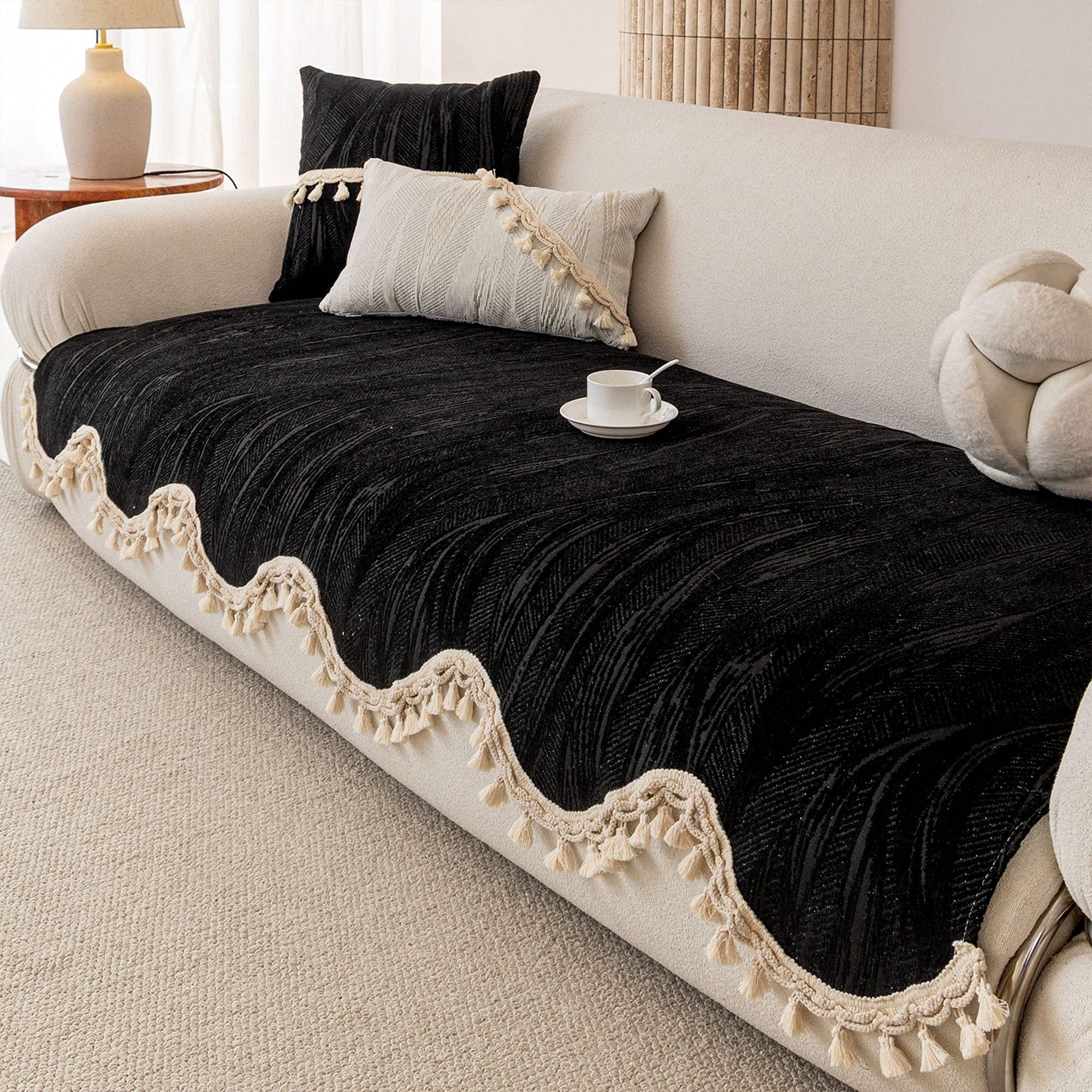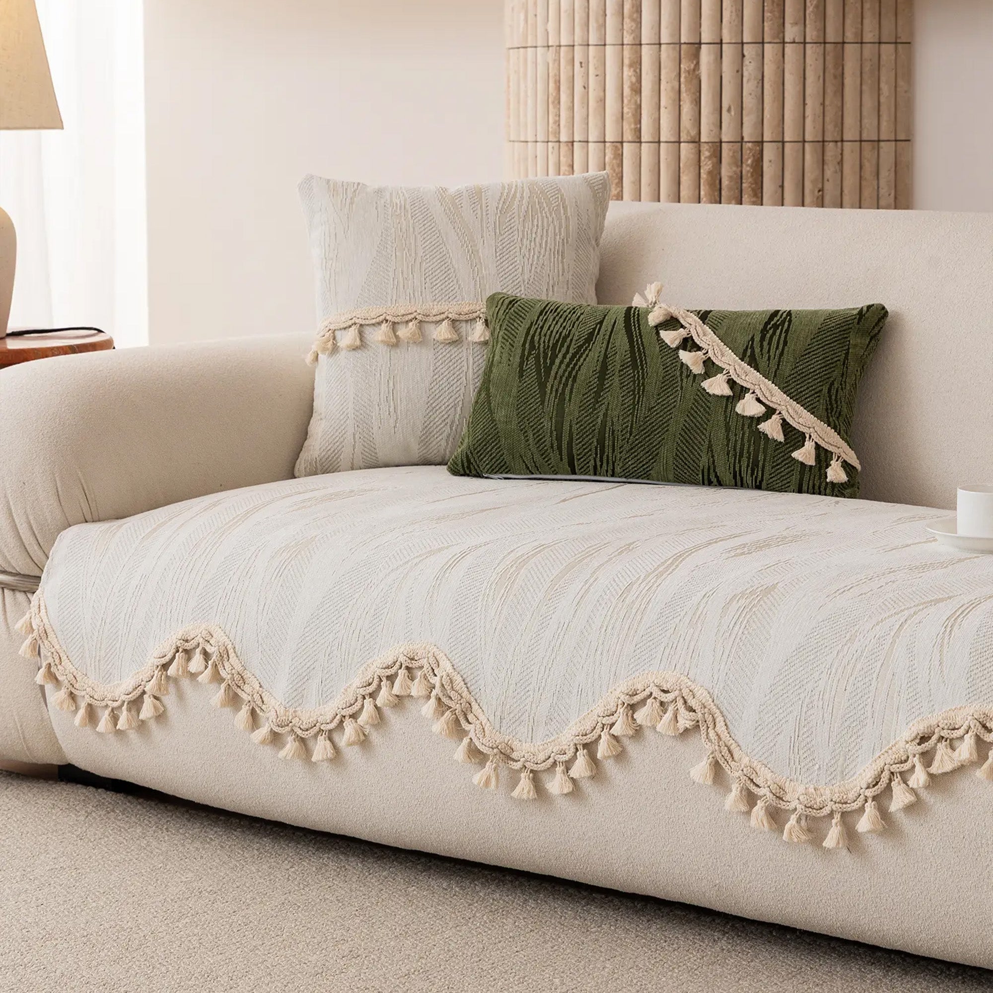 Elegant randigt pompom-chinille-sofföverdrag med halkfri finish