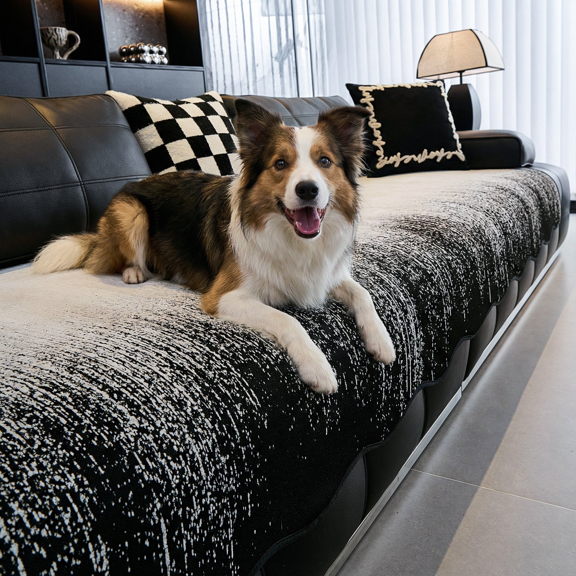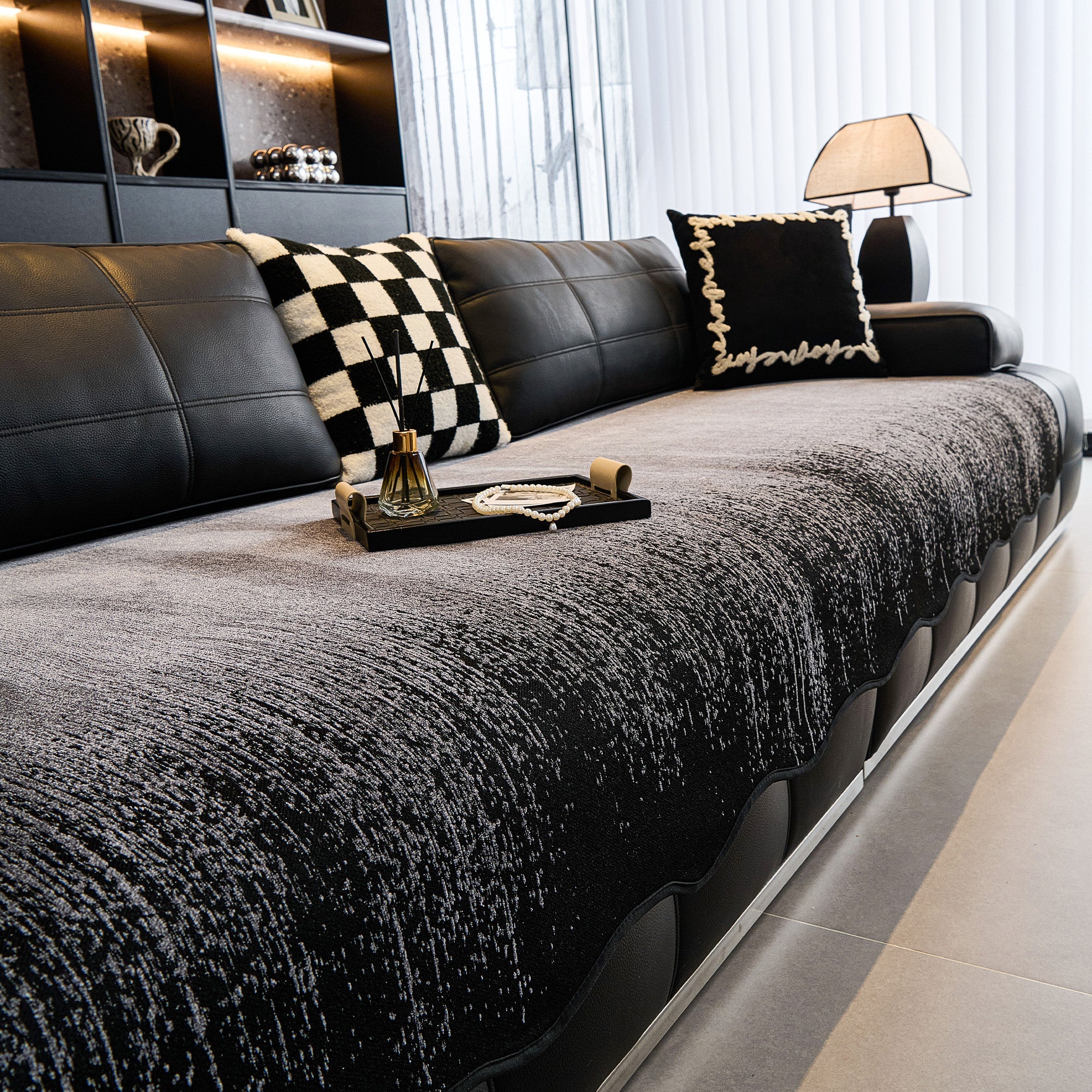 •Halkfri baksida och viktade kanter håller överdraget säkert på plats – även på oregelbundna soffformer