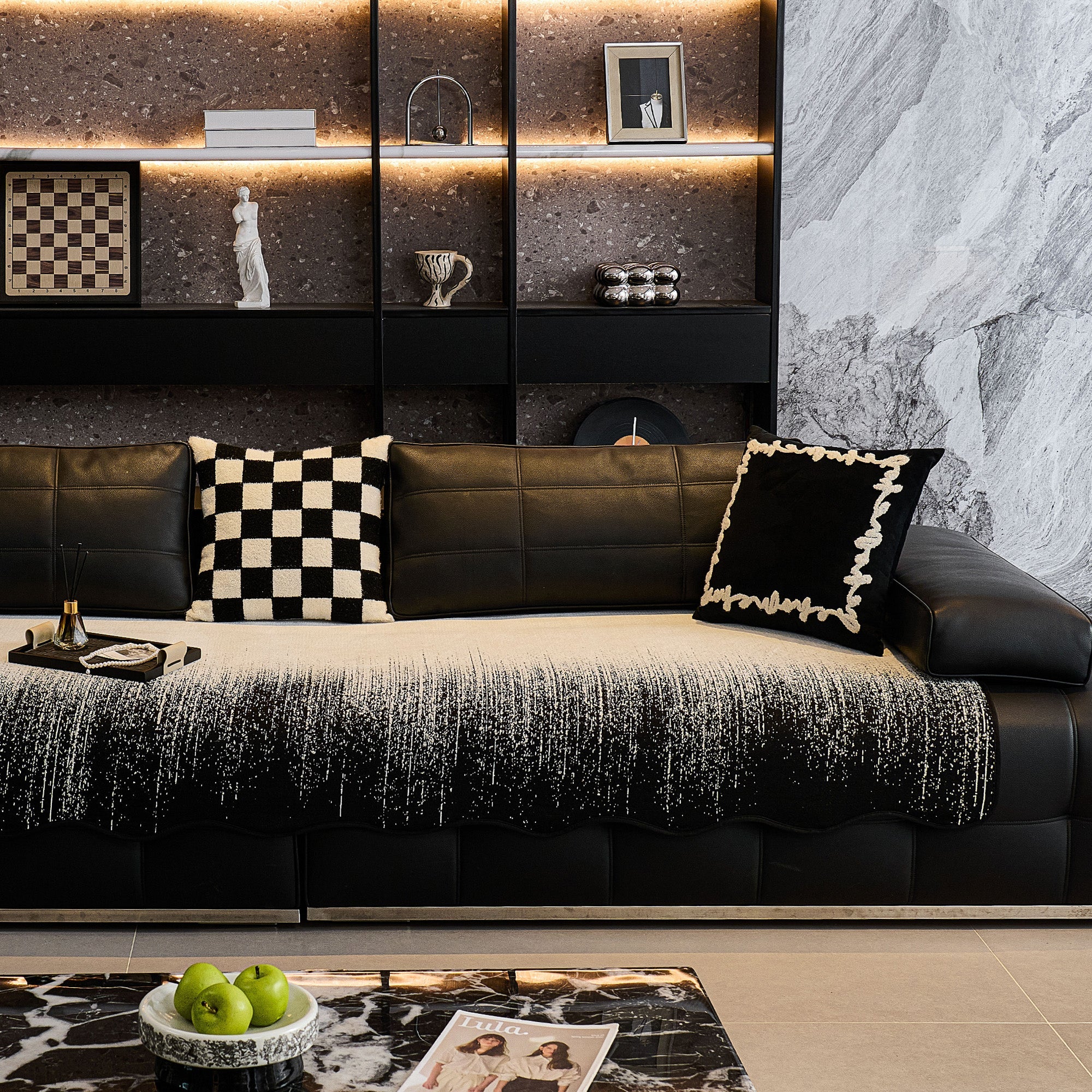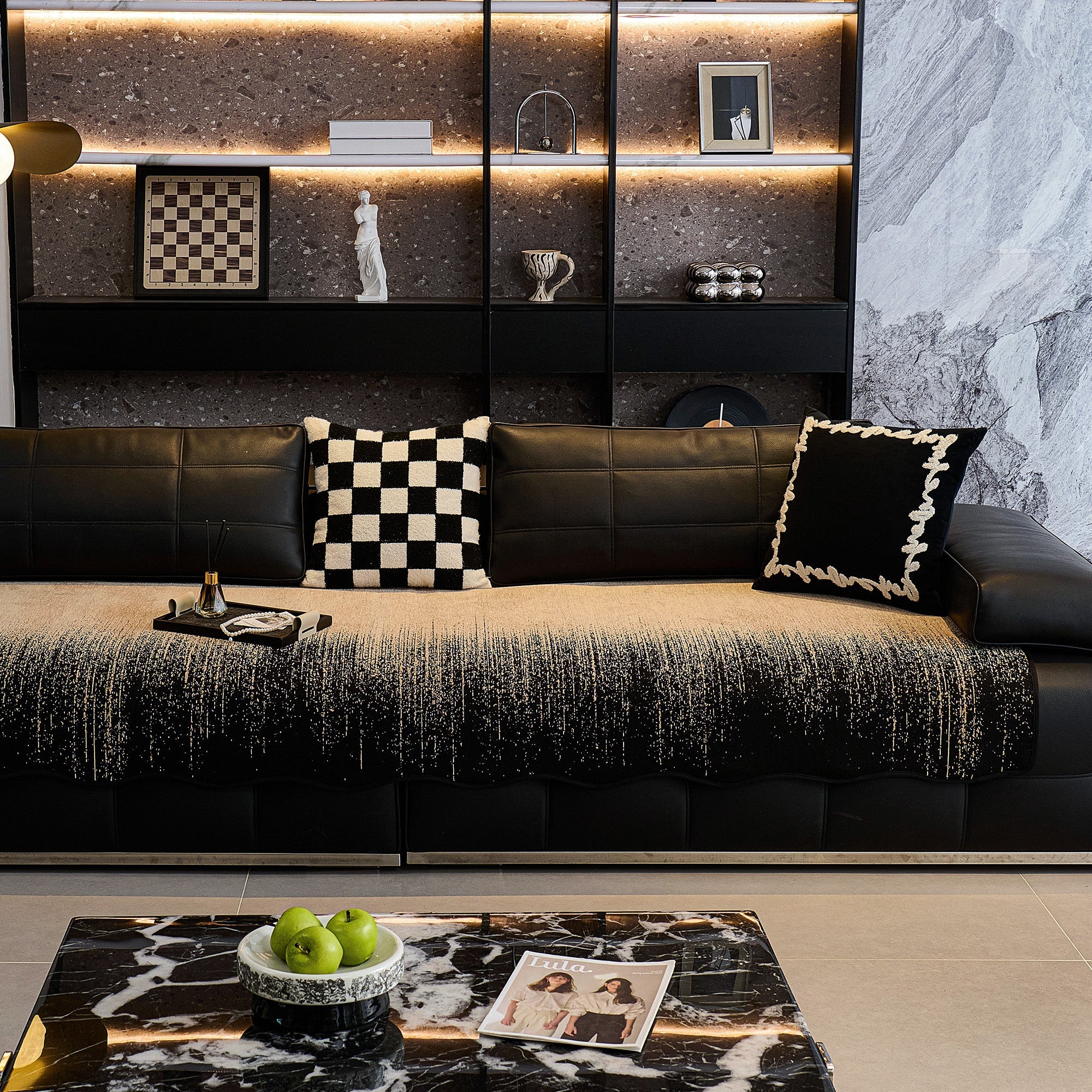 Förhöj ditt vardagsrum med den raffinerade texturen och den moderna konsten hos vårt Luxe Ombré Chenille halkfria sofföverdrag.