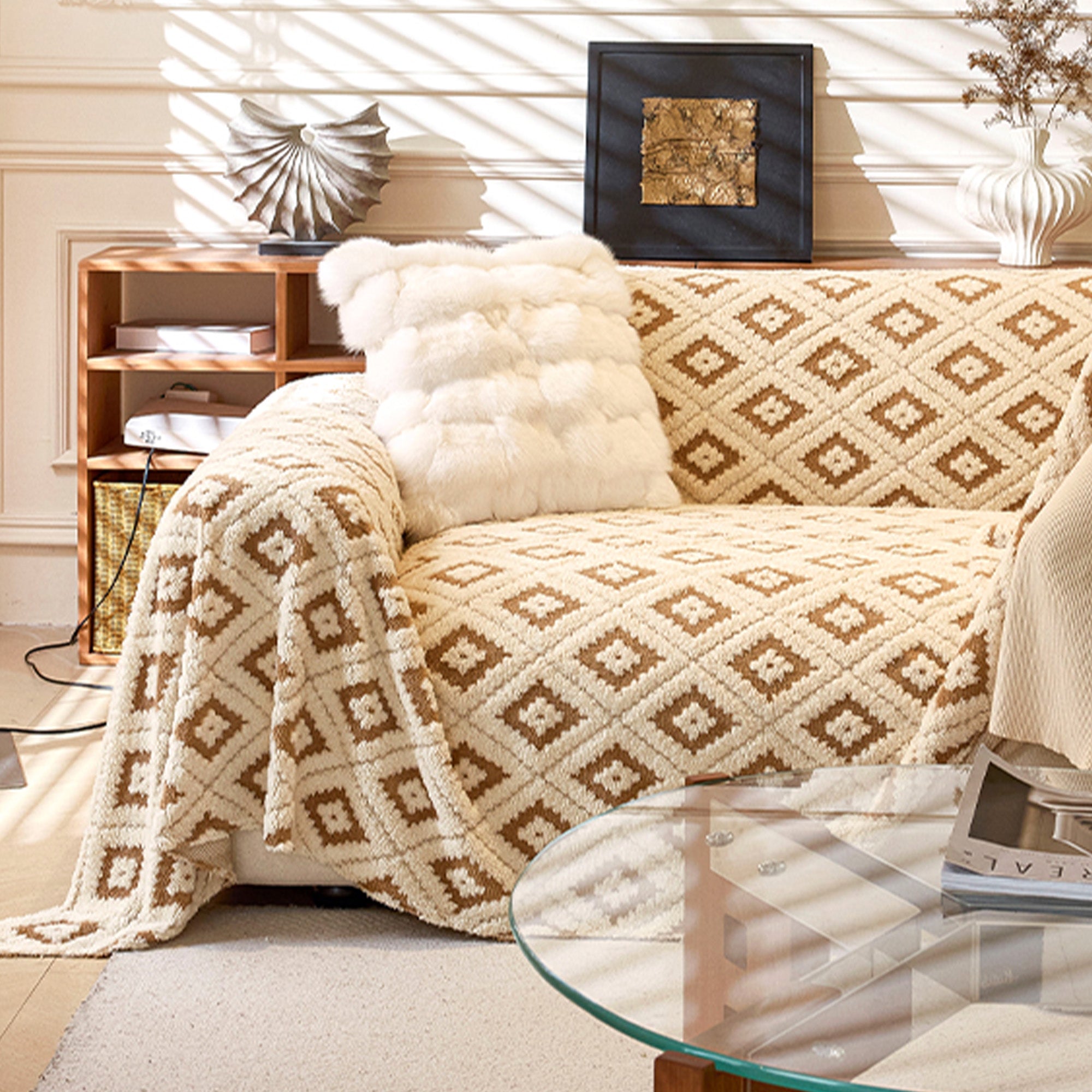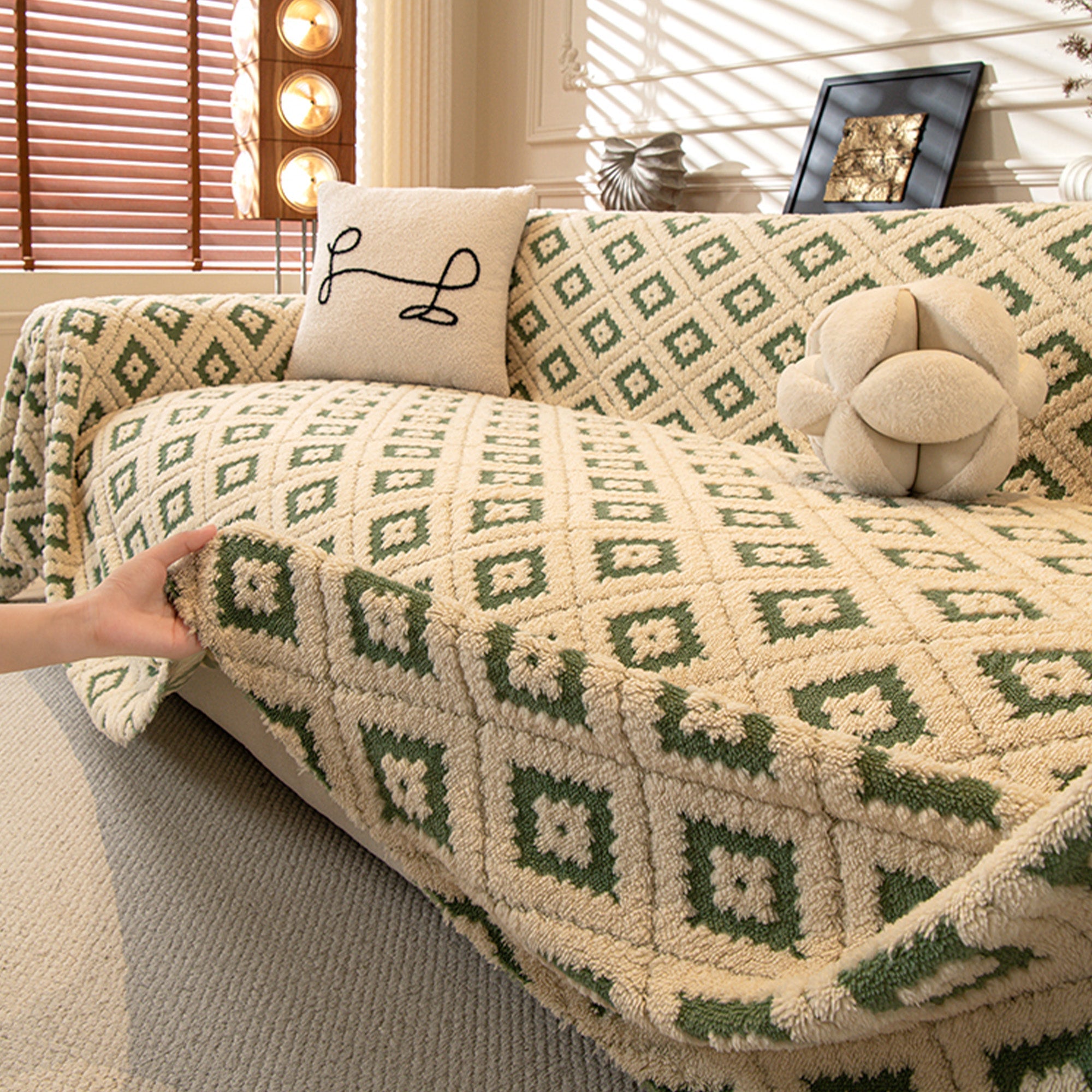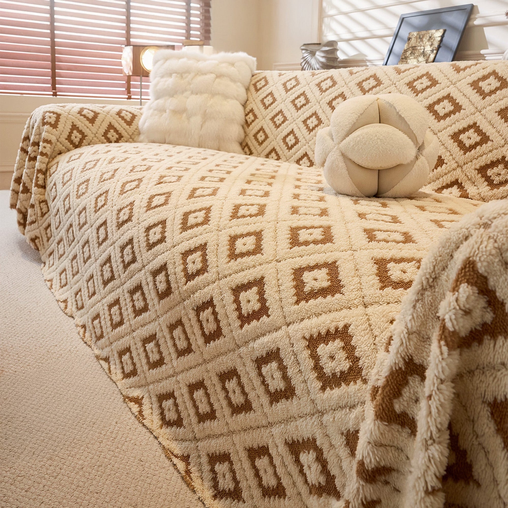 Svep in din soffa i plyschkomfort och modern stil med vårt Cozy Diamond Plush Nonslip-sofföverdrag. Det upphöjda diamant-jacquardtyget ger en rik textur, medan det tjocka, husdjursvänliga plyschtyget skyddar mot dagligt slitage, päls och repor. Mjukt vid beröring men ändå hållbart, det sitter på plats och lyfter omedelbart ditt utrymme.