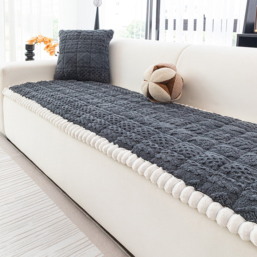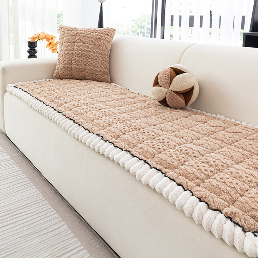 Svep in din soffa i mjuk värme med vårt Cozy Weave Plush Non-halk sofföverdrag. Tillverkat av kraftigt tyg med kort lugg och en 3D-jacquardväv, ger det en mjuk känsla och ett raffinerat, texturerat utseende. Den rundade plyschkanten ger en elegant och mysig accent samtidigt som den skyddar kanterna mot slitage.