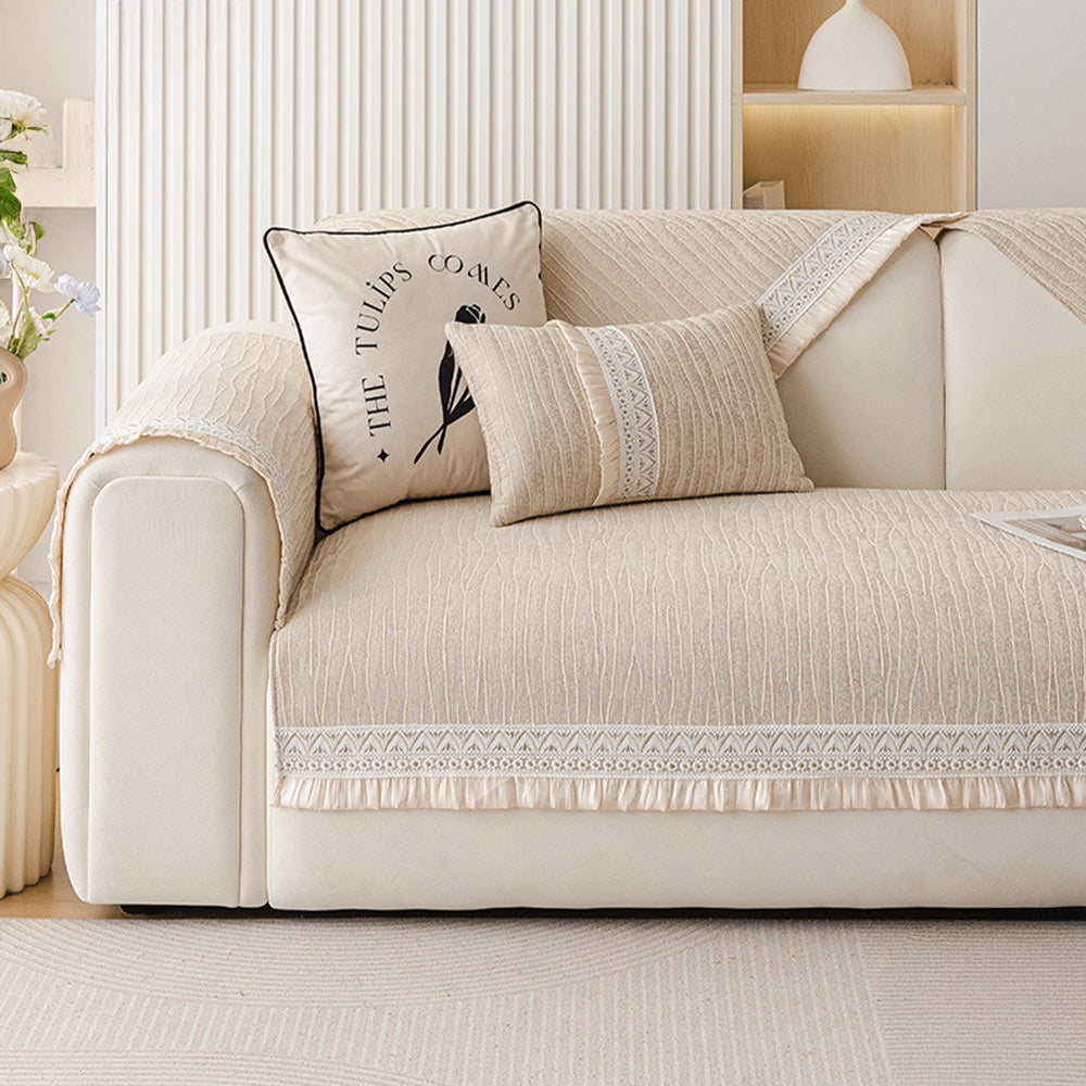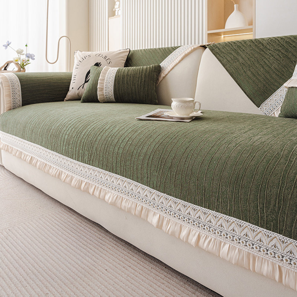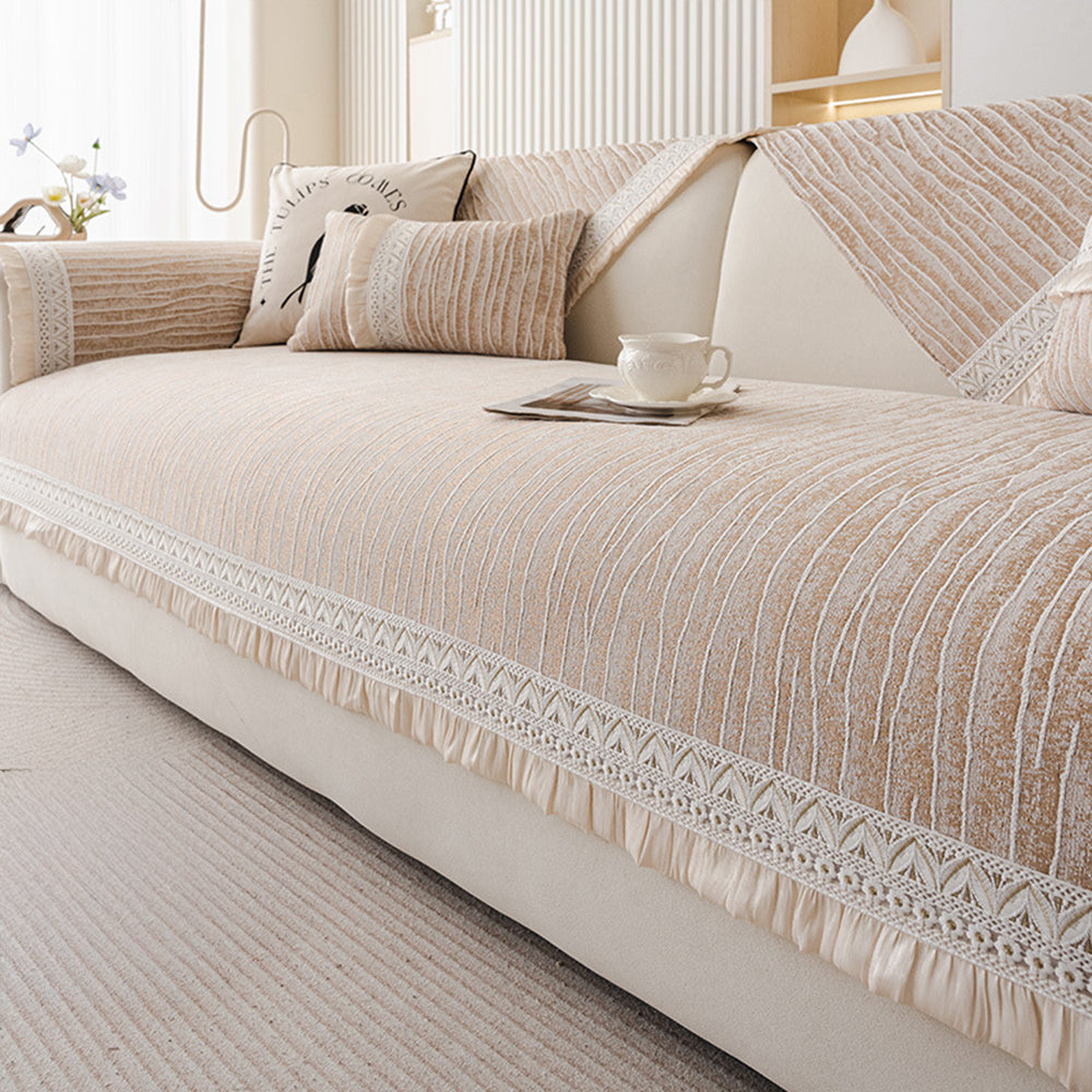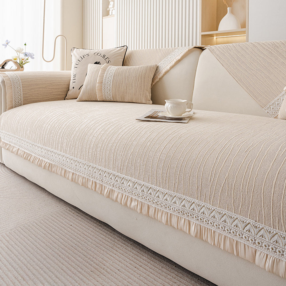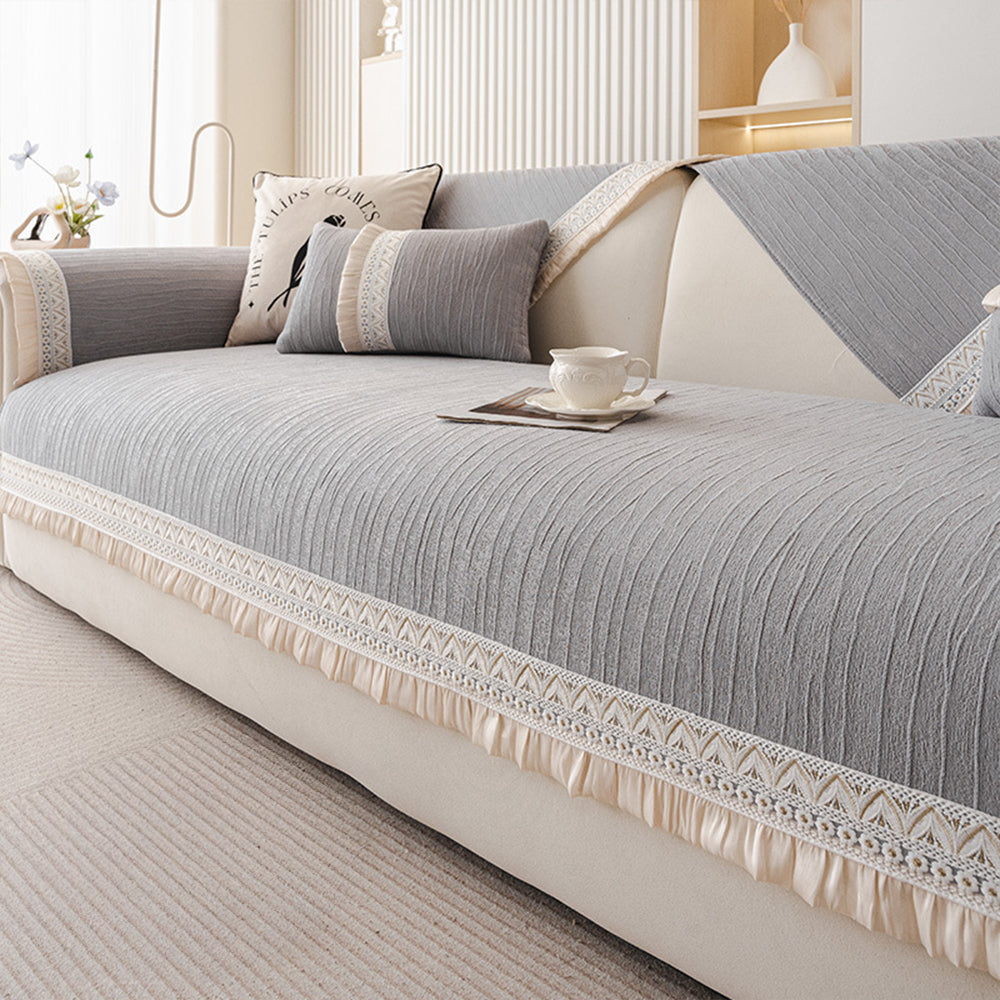 Klä din soffa i raffinerad komfort med vårt Elegant Lace Chenille Non-halk sofföverdrag. Den ribbade chenilleytan känns mjuk men ändå andningsbar, medan en säker halkfri baksida hjälper till att hålla varje del på plats i läder- eller tygsoffor. Delikat spets och mjuk volangkant ger en lätt och lyxig touch som lyfter vilket vardagsrum som helst.