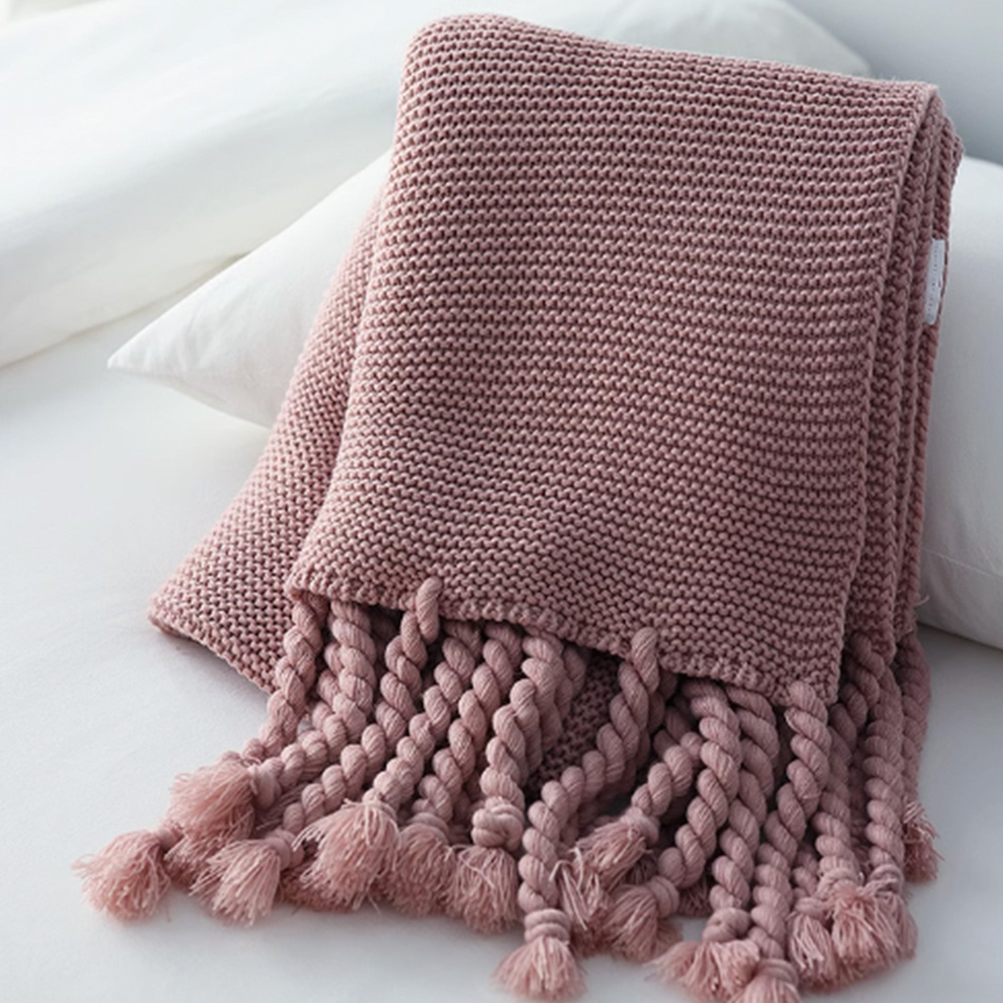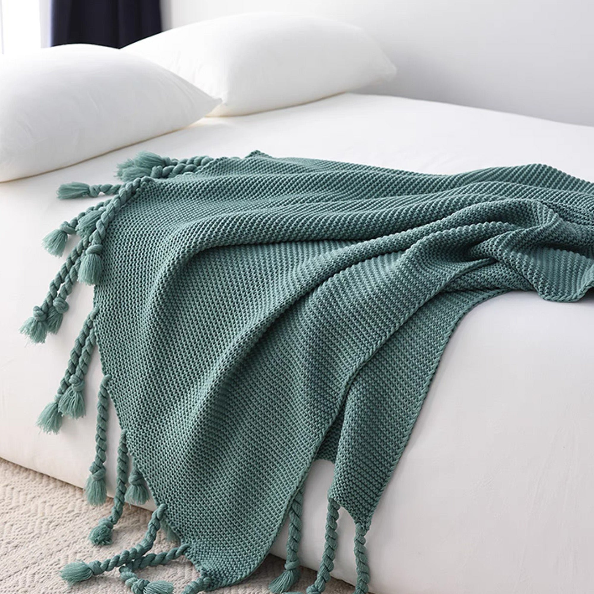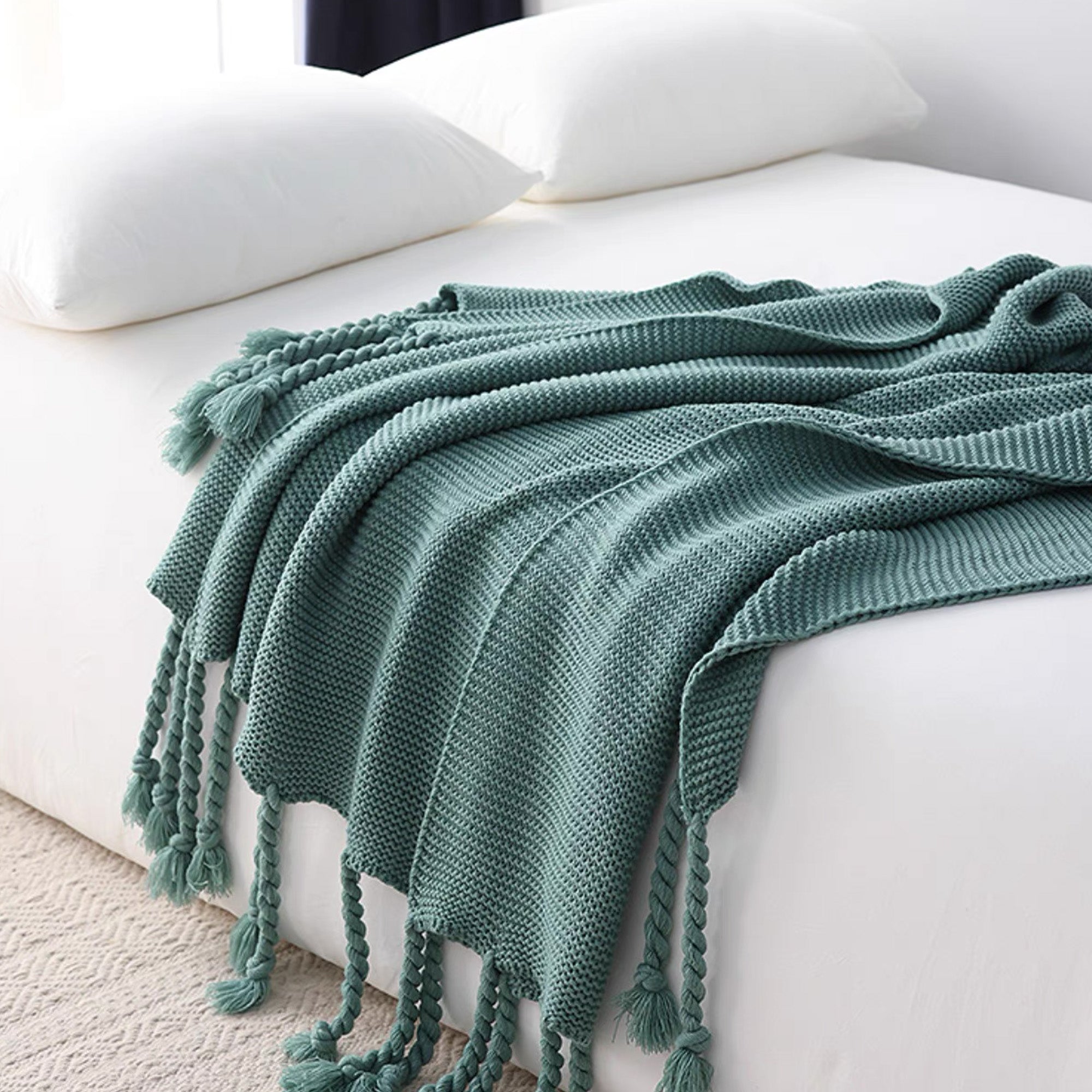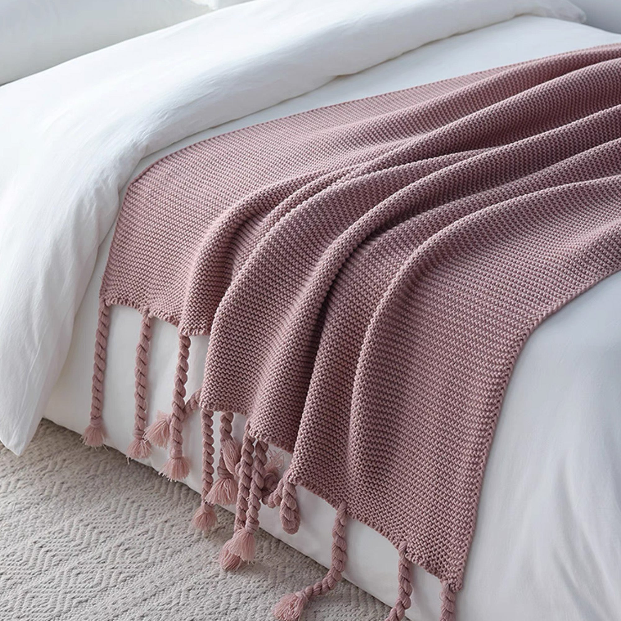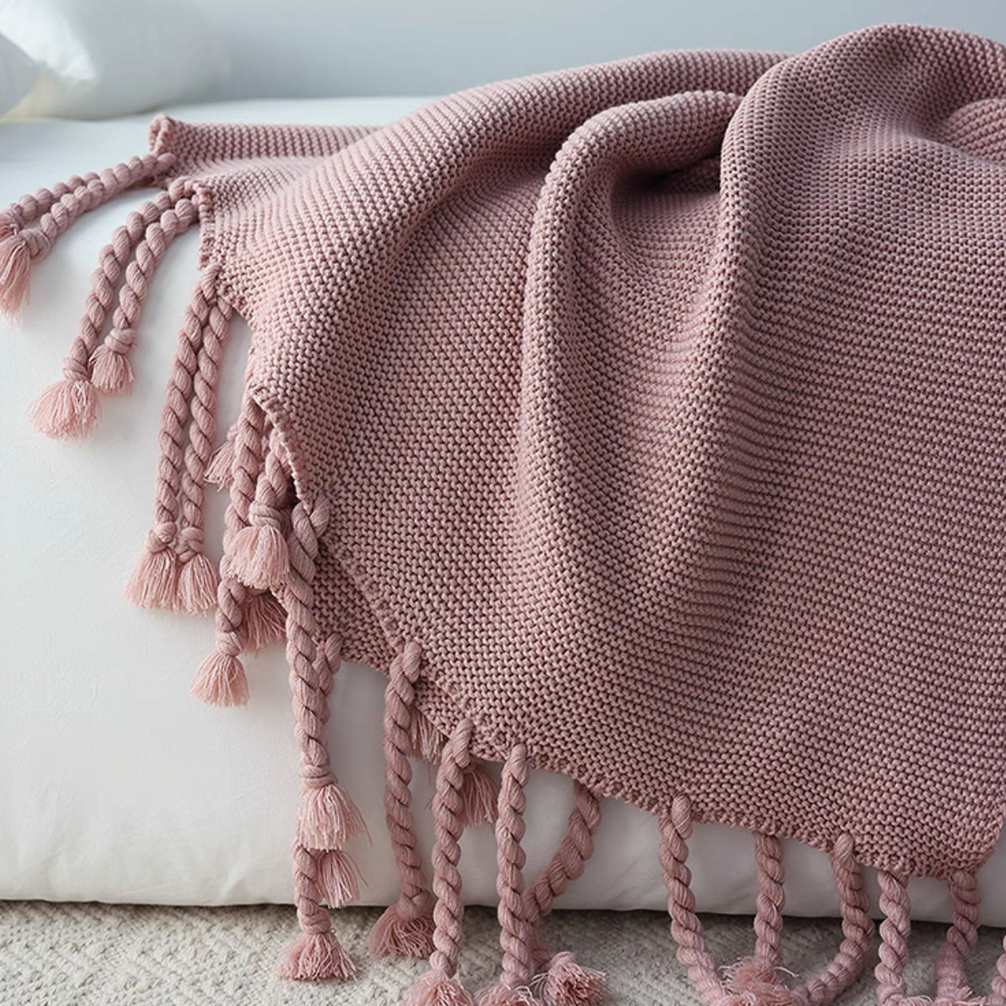 Mysig, grov stickad filt med tofsar