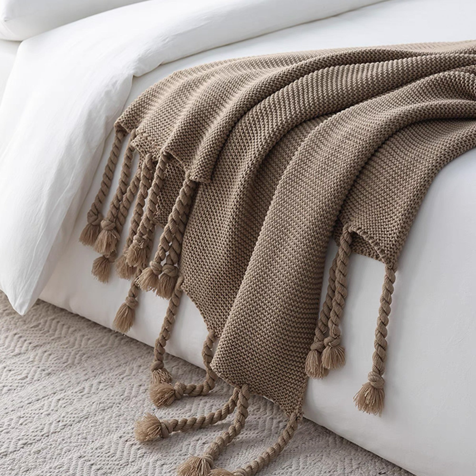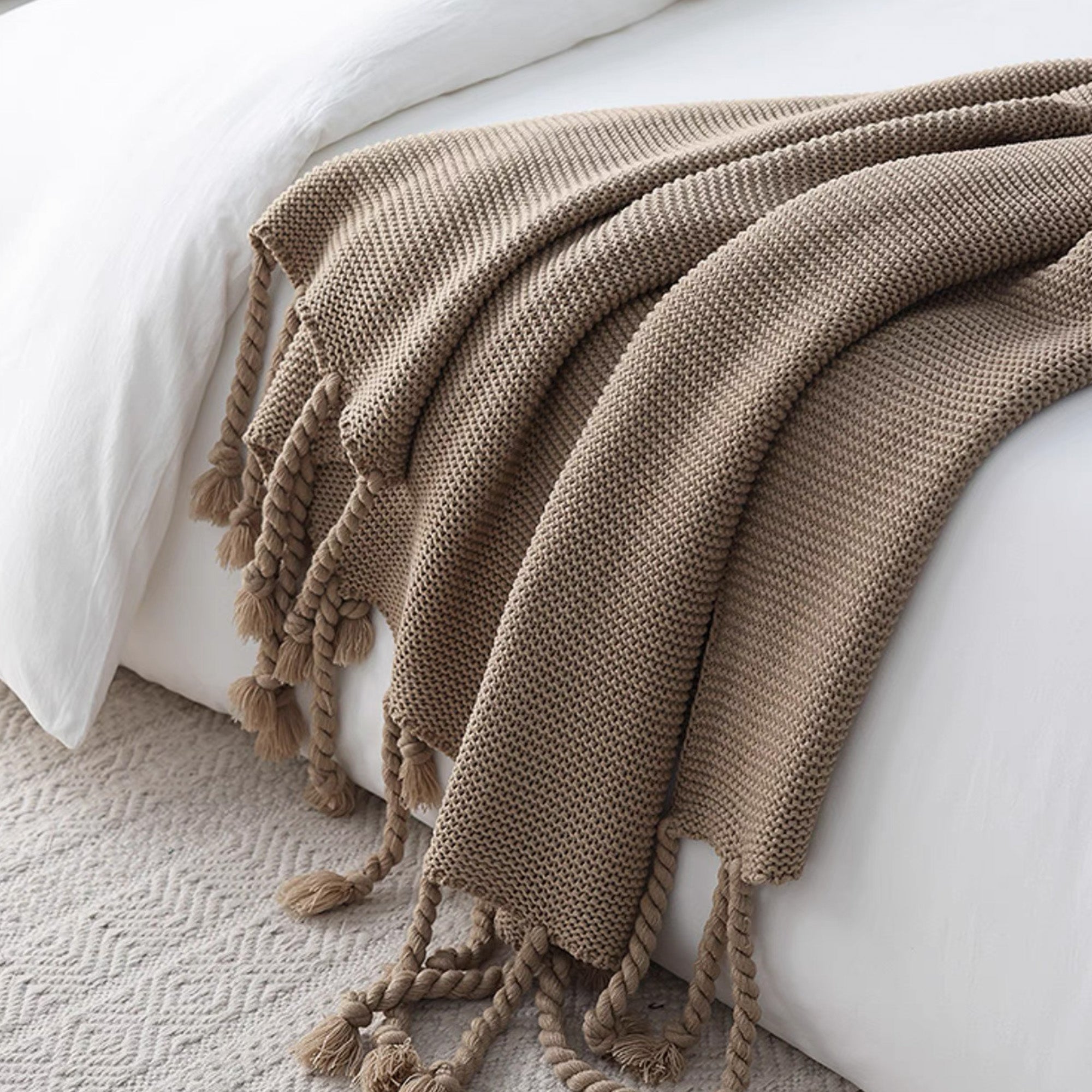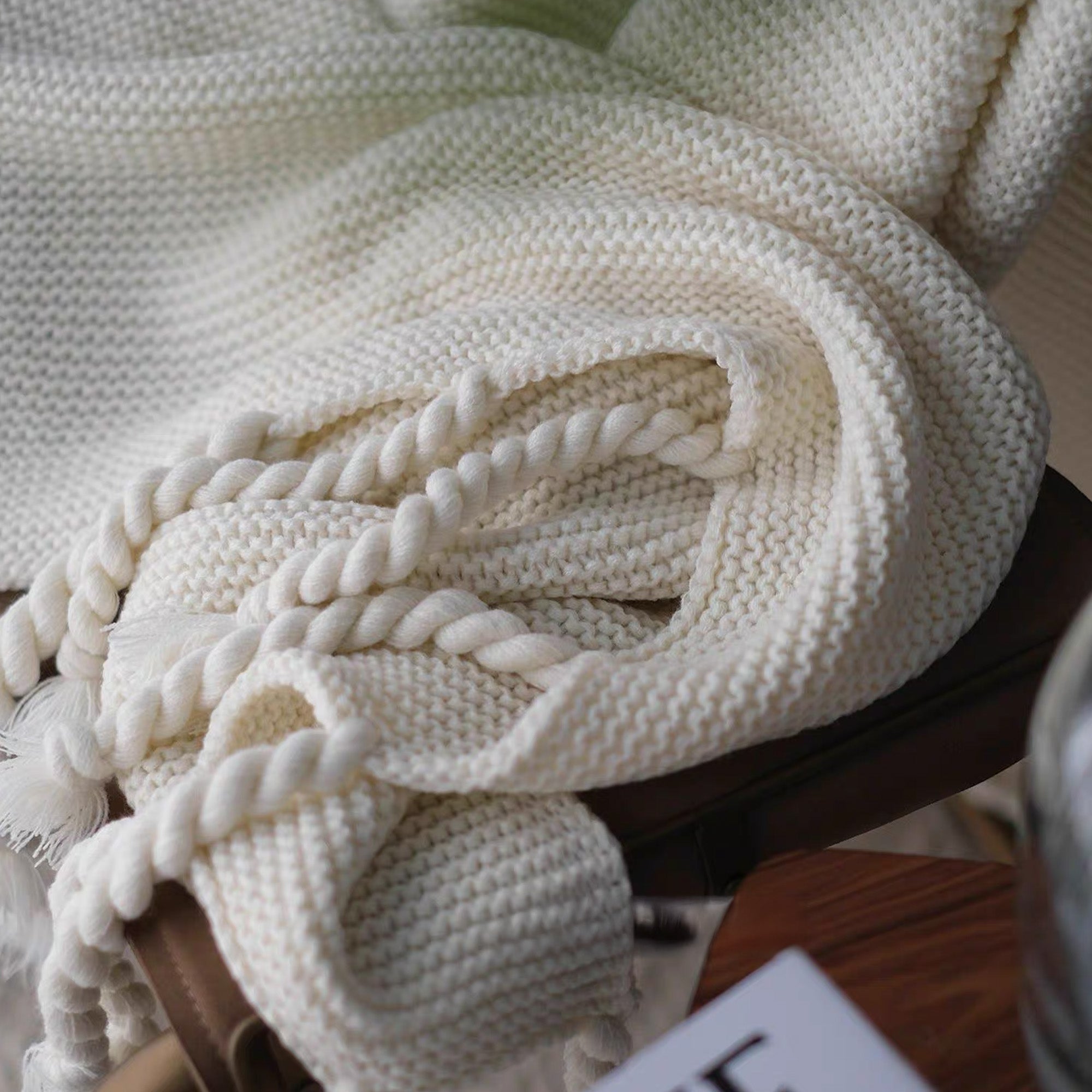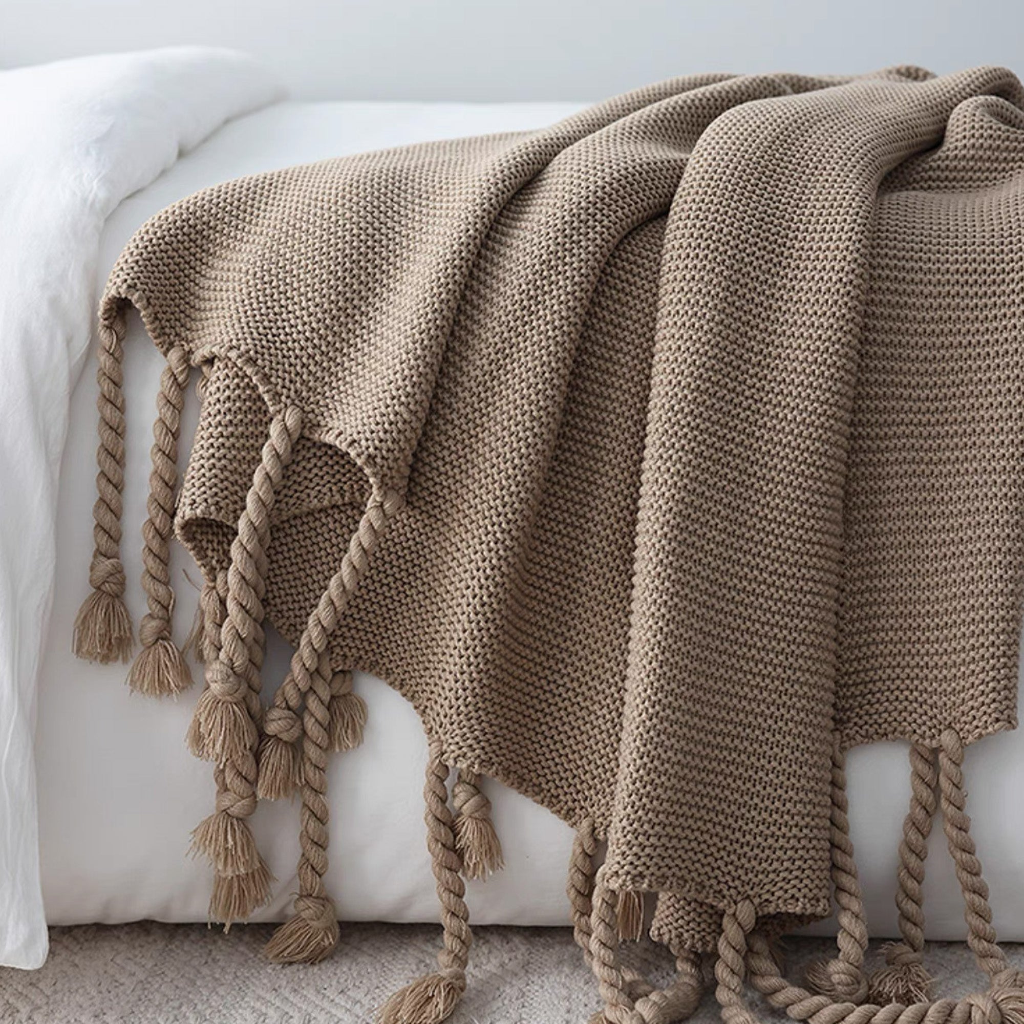 Omfamna värme och elegans med vår Chunky Knitted Tassel Throw Blanket. Denna mysiga filt har en vackert texturerad stickning och lekfulla, överdimensionerade tofsar för en touch av bohemisk charm. Tillverkad av ultramjuka material är den perfekt för att ge din säng, soffa eller läshörna ett lager av komfort. De neutrala tonerna gör den mångsidig för alla inredningsstilar, oavsett om den är modern, rustik eller minimalistisk.