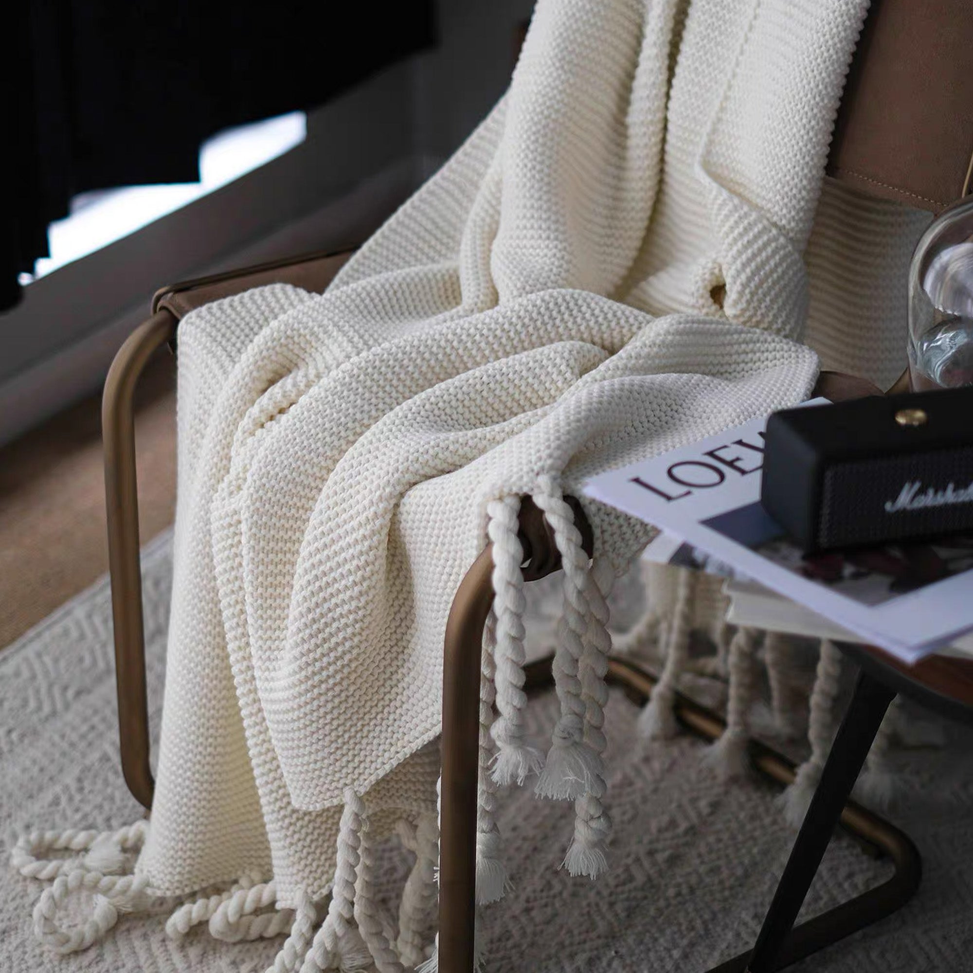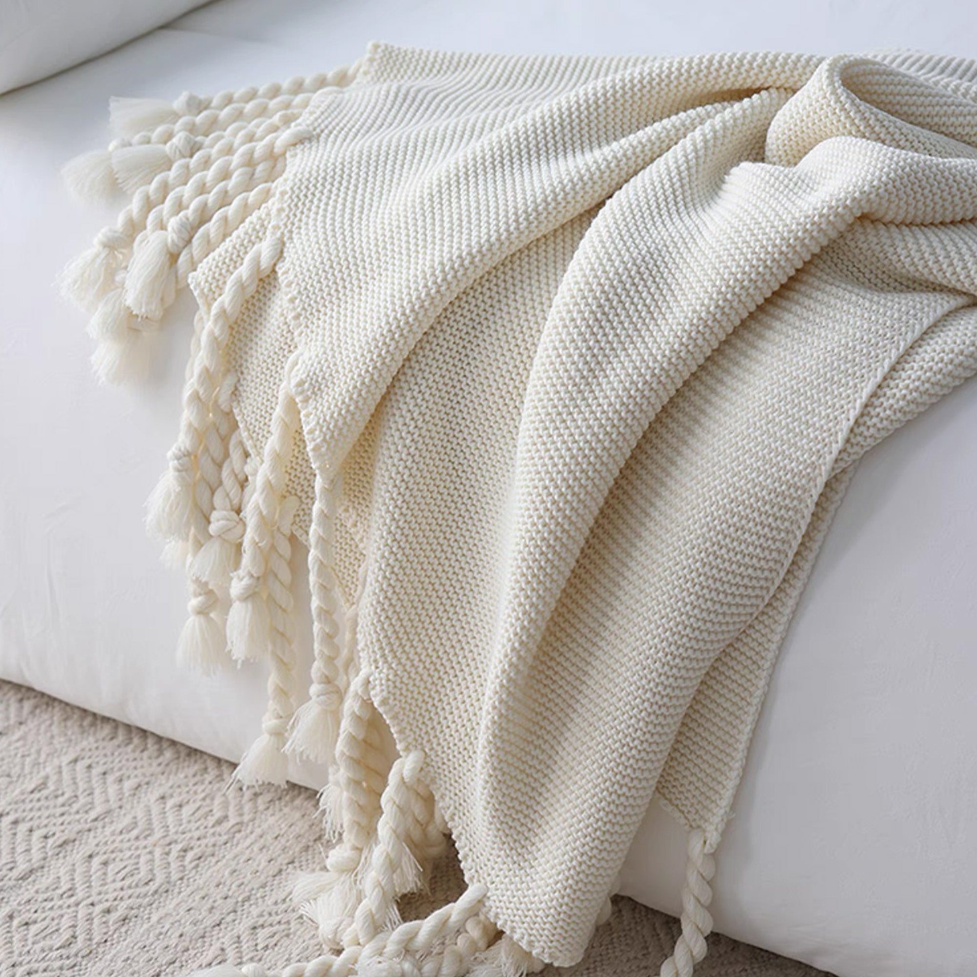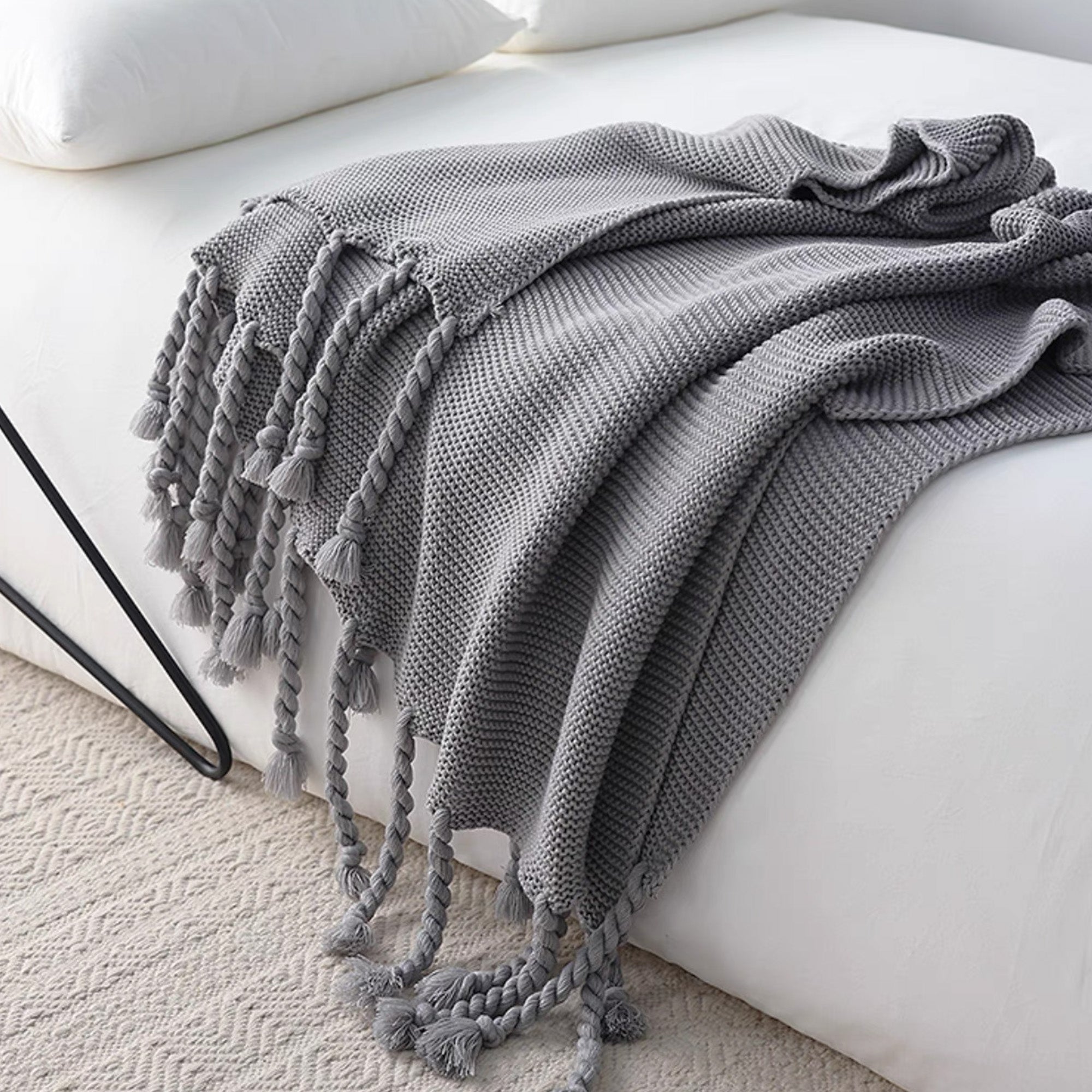 Omfamna värme och elegans med vår Chunky Knitted Tassel Throw Blanket. Denna mysiga filt har en vackert texturerad stickning och lekfulla, överdimensionerade tofsar för en touch av bohemisk charm. Tillverkad av ultramjuka material är den perfekt för att ge din säng, soffa eller läshörna ett lager av komfort. De neutrala tonerna gör den mångsidig för alla inredningsstilar, oavsett om den är modern, rustik eller minimalistisk.