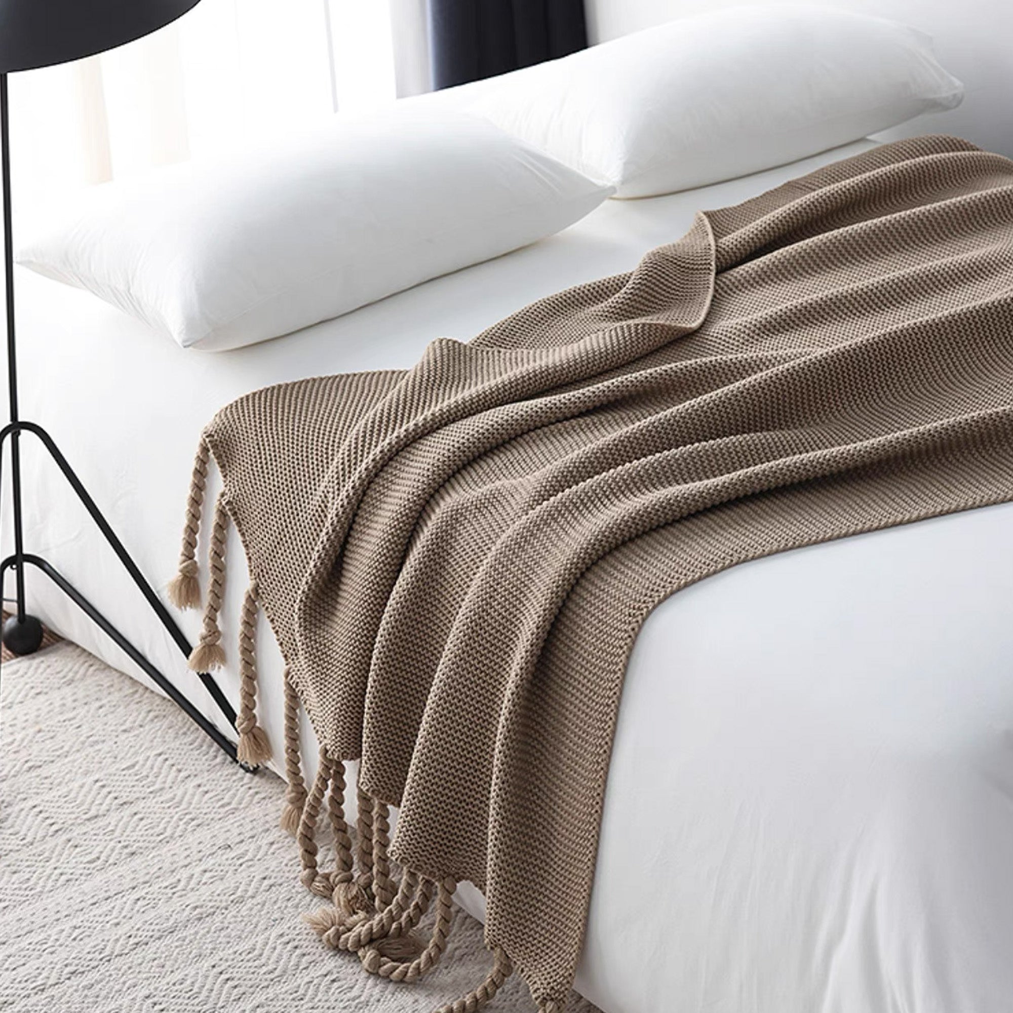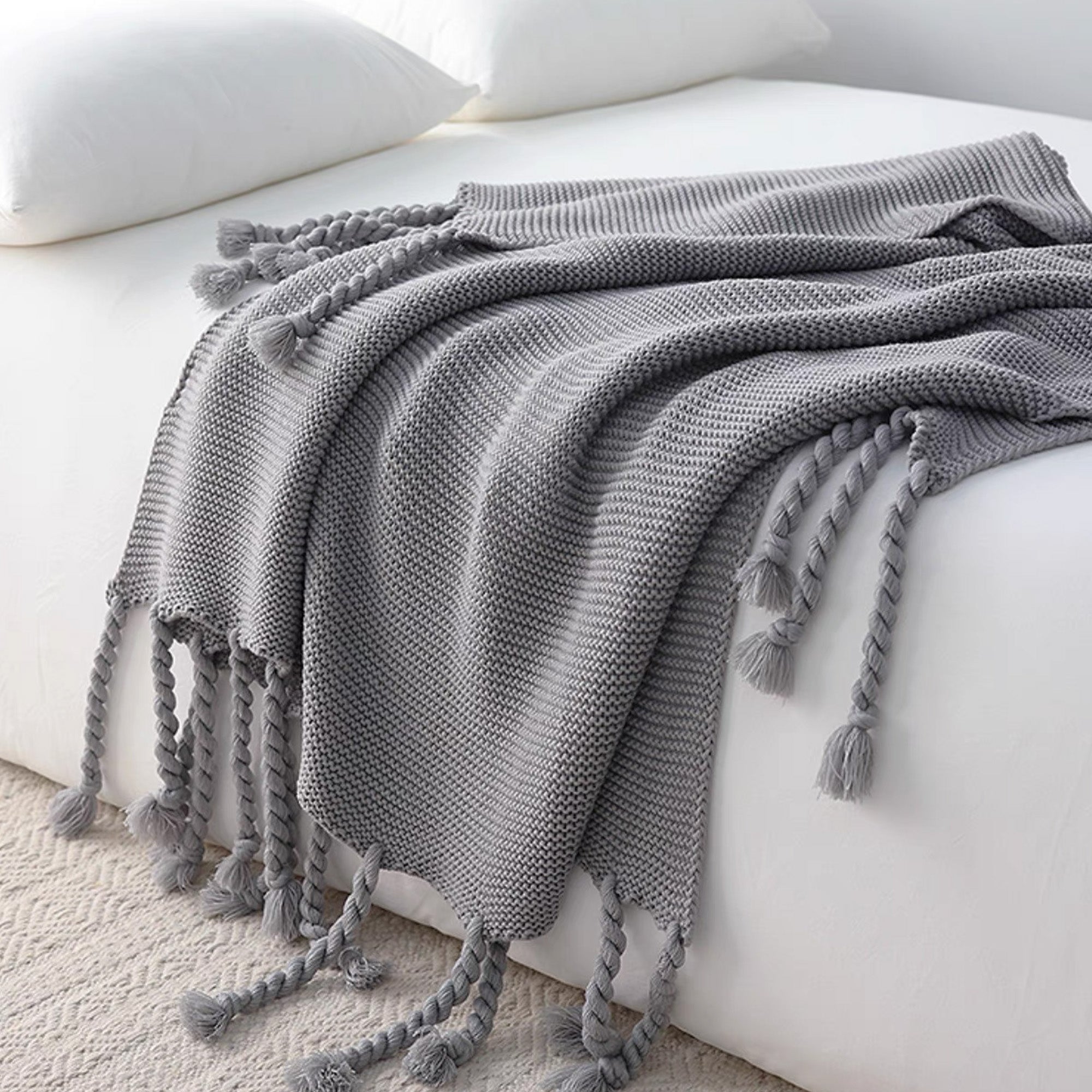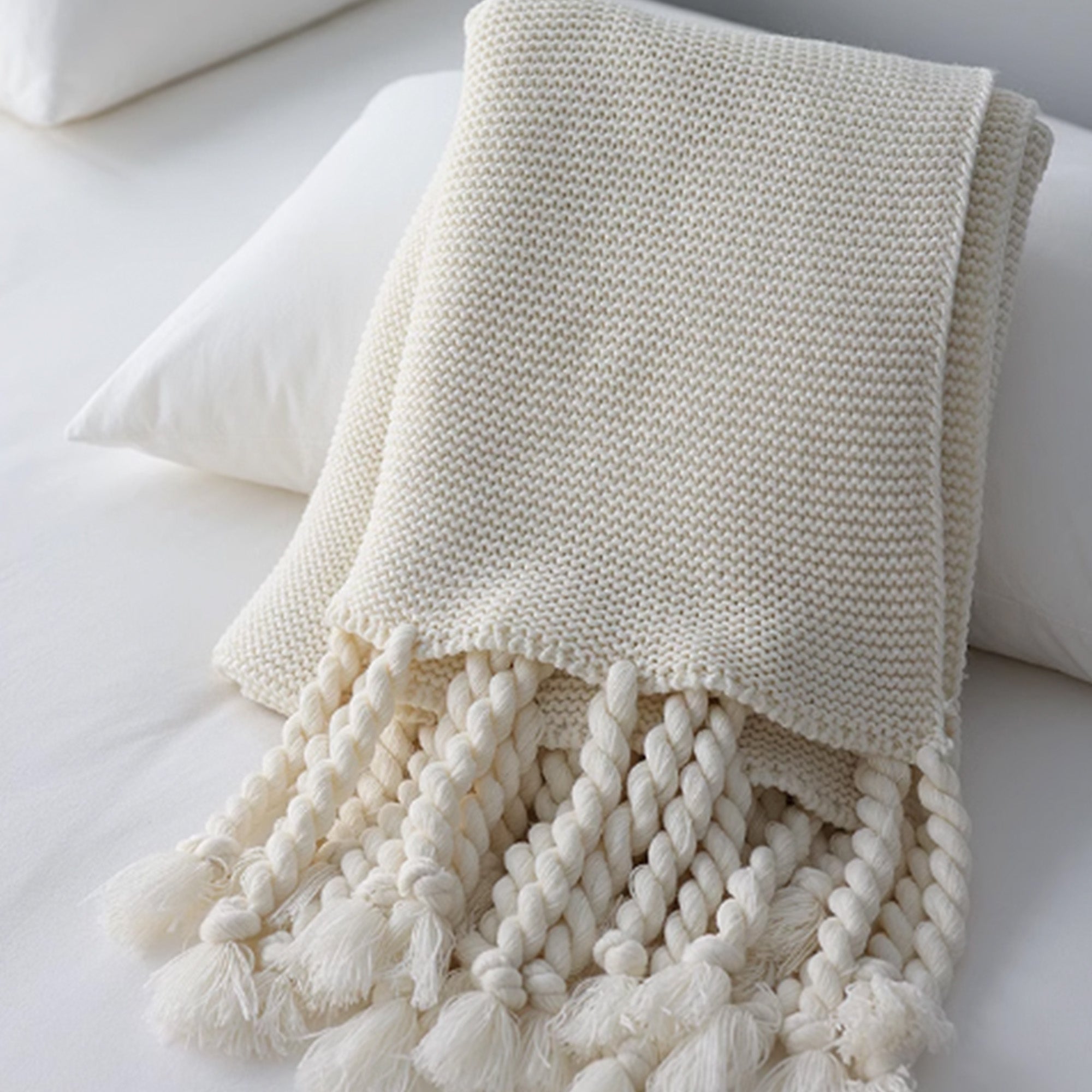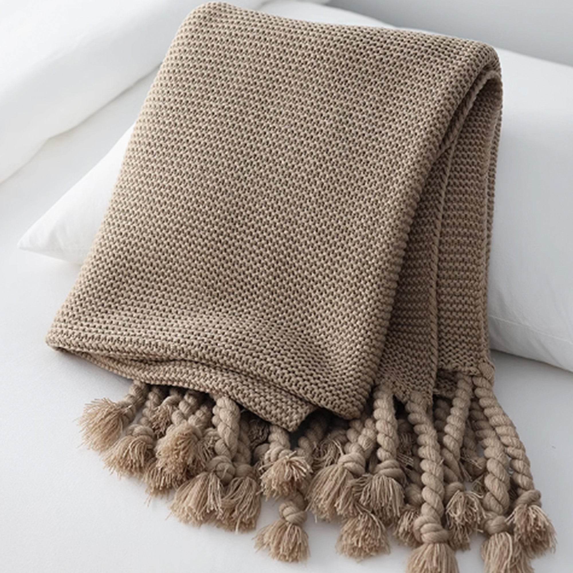 Omfamna värme och elegans med vår Chunky Knitted Tassel Throw Blanket. Denna mysiga filt har en vackert texturerad stickning och lekfulla, överdimensionerade tofsar för en touch av bohemisk charm. Tillverkad av ultramjuka material är den perfekt för att ge din säng, soffa eller läshörna ett lager av komfort. De neutrala tonerna gör den mångsidig för alla inredningsstilar, oavsett om den är modern, rustik eller minimalistisk.