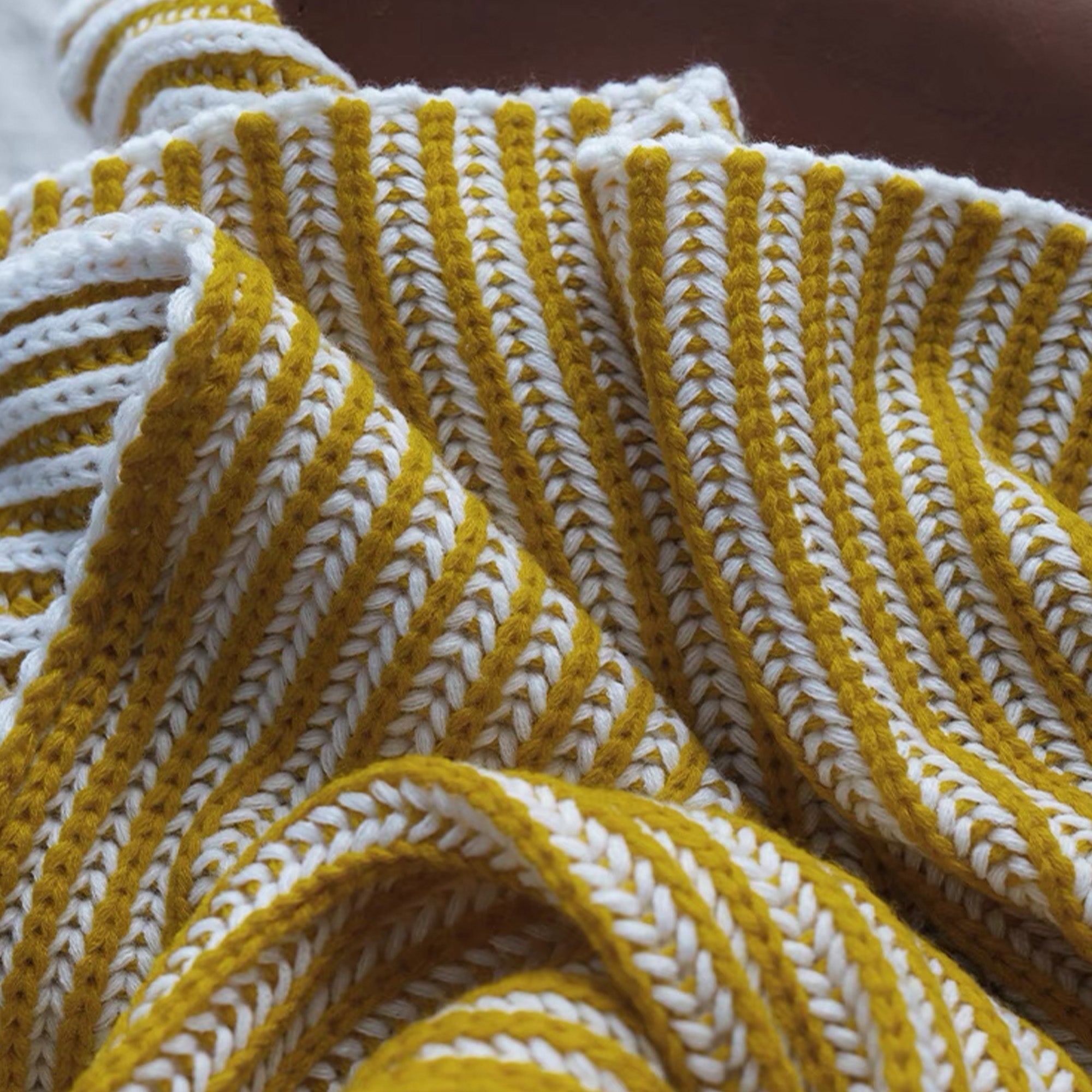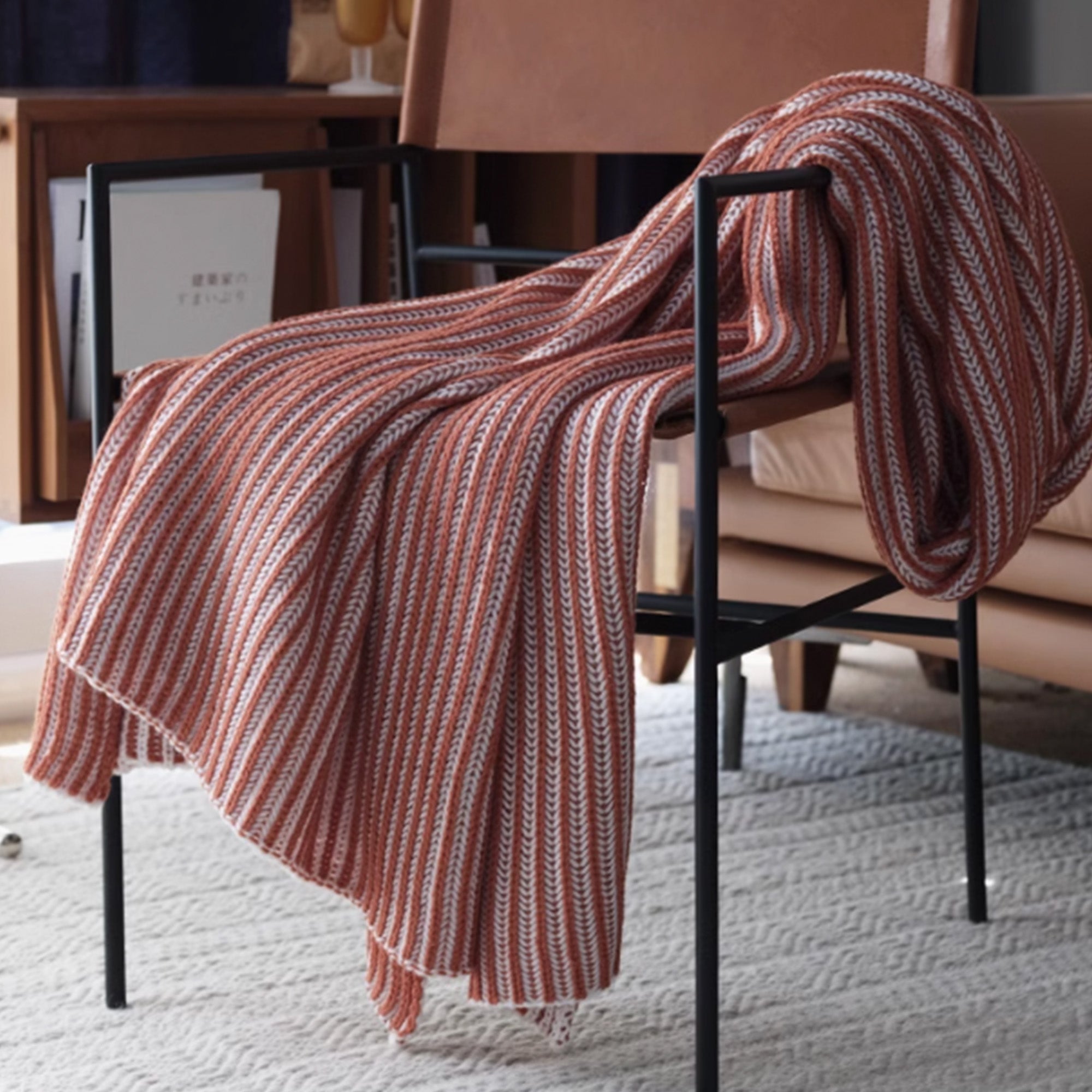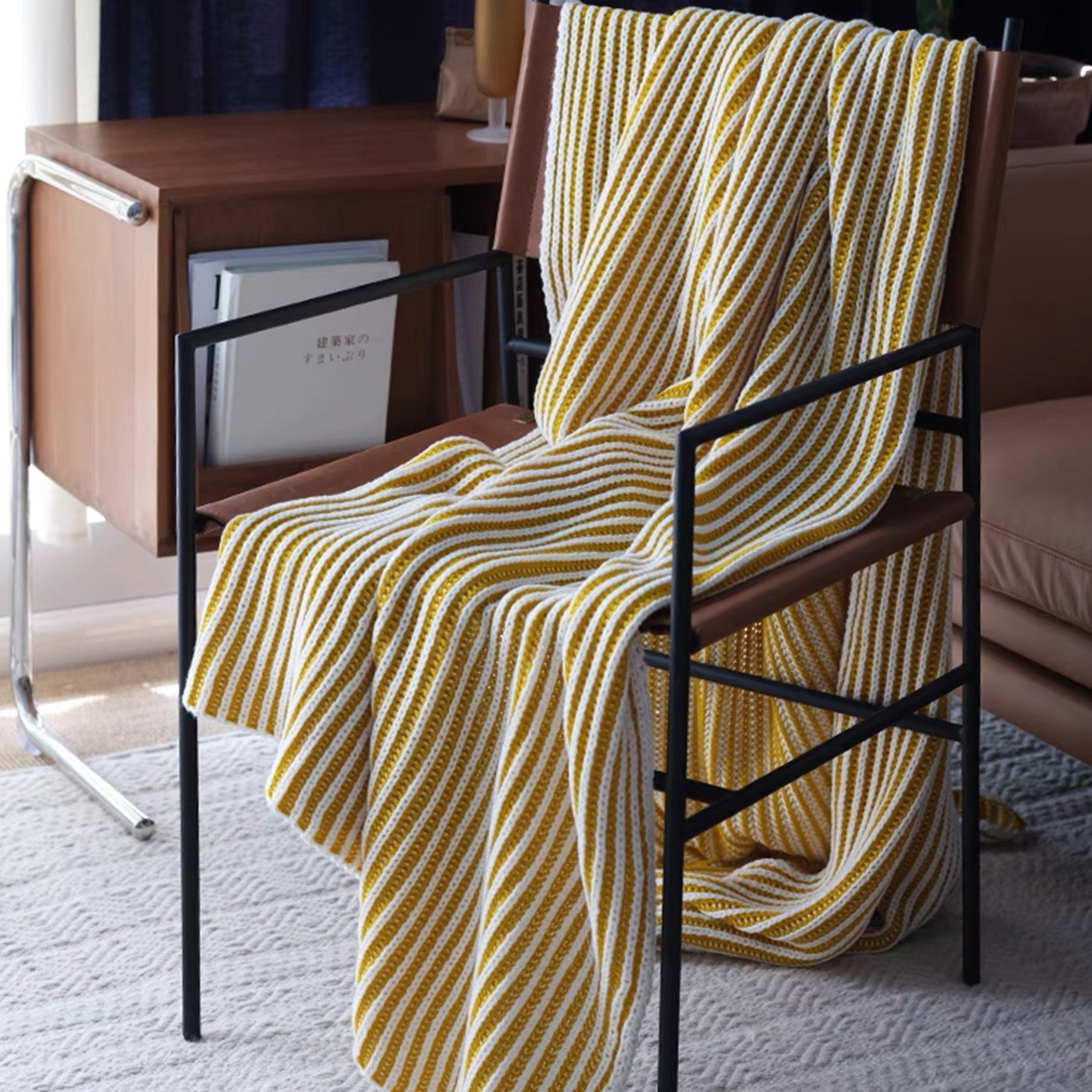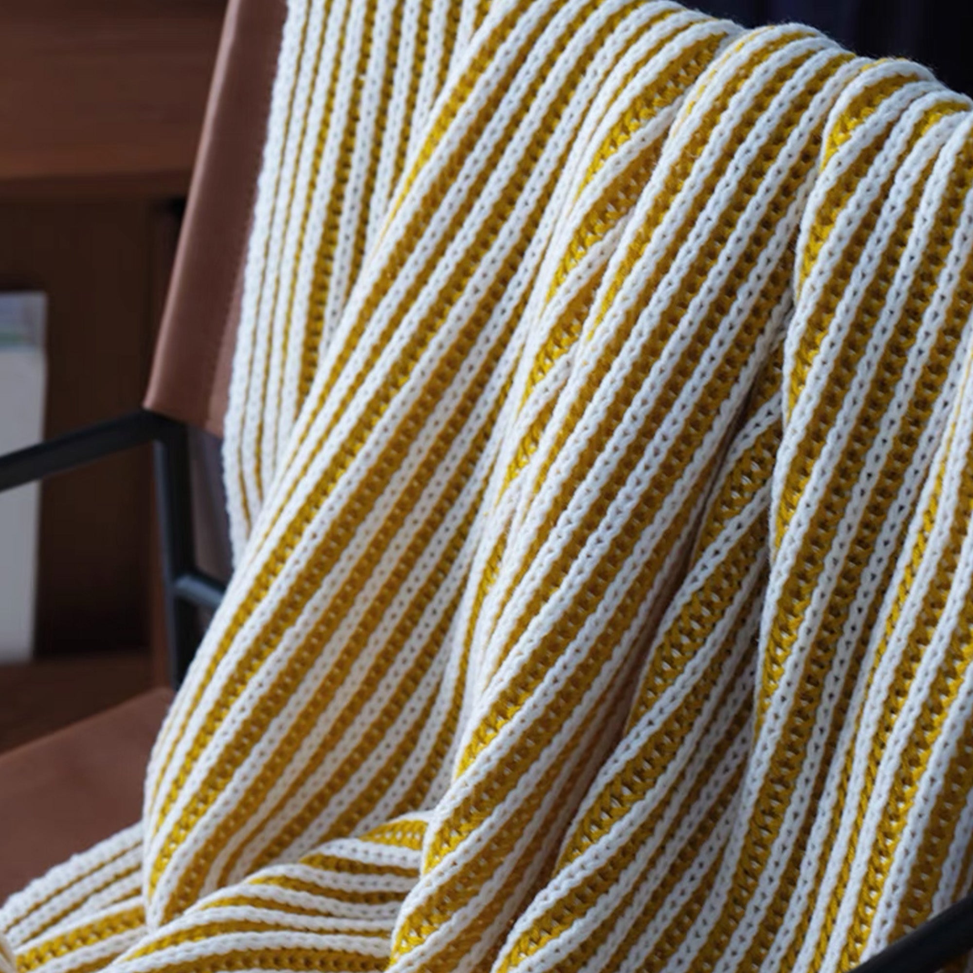 Ljusa upp ditt utrymme med värmen från vår mysiga ribbstickade filt. Denna färgstarka filt har ett unikt tvåfärgat randigt mönster som ger en glad färgklick till vilket rum som helst. Tillverkad av högkvalitativt, mysigt stickat tyg, perfekt att mysa upp under svalare dagar eller drapera över din favoritfåtölj för en elegant accent.