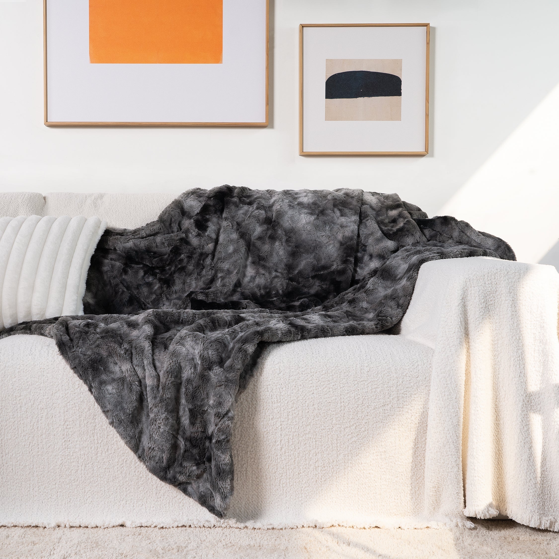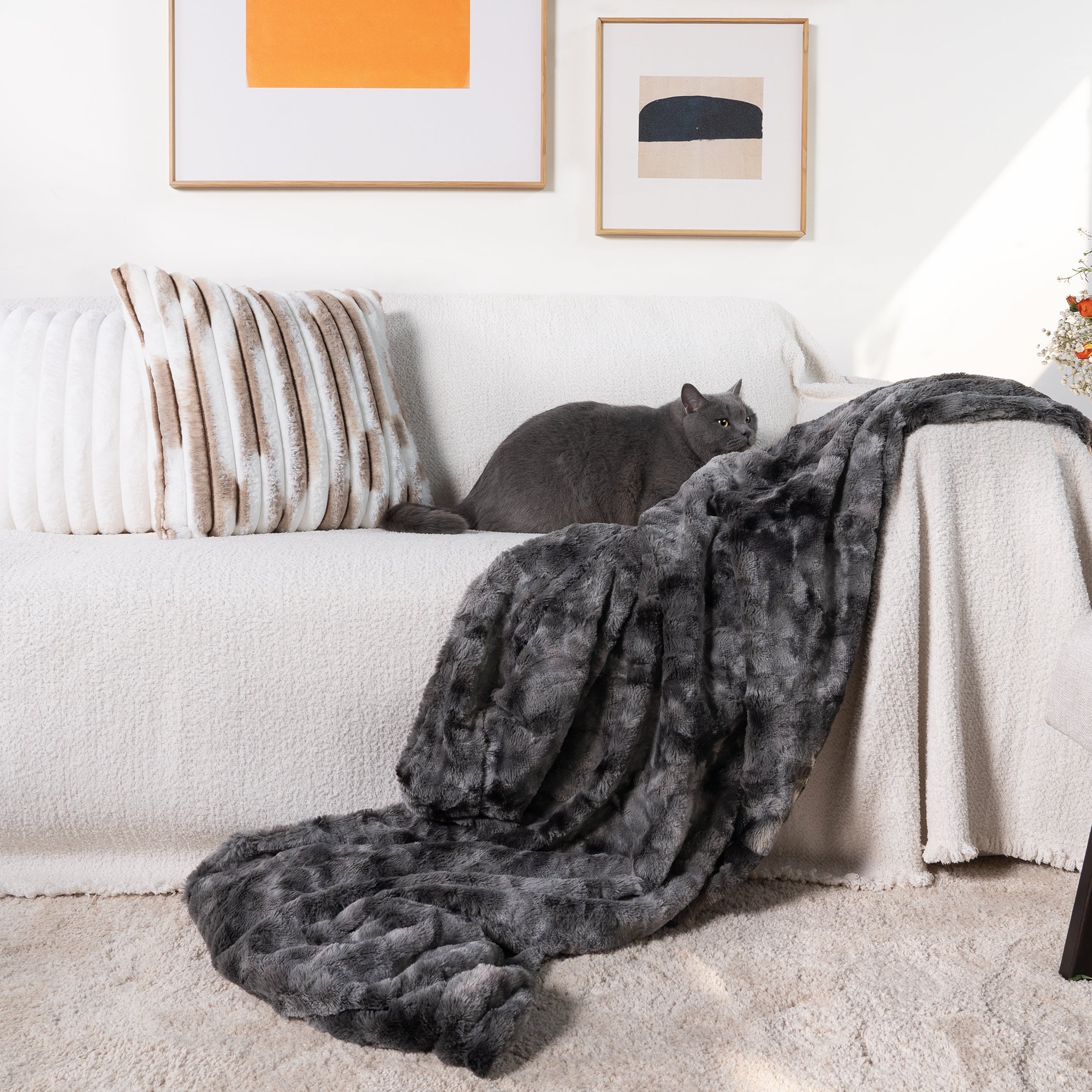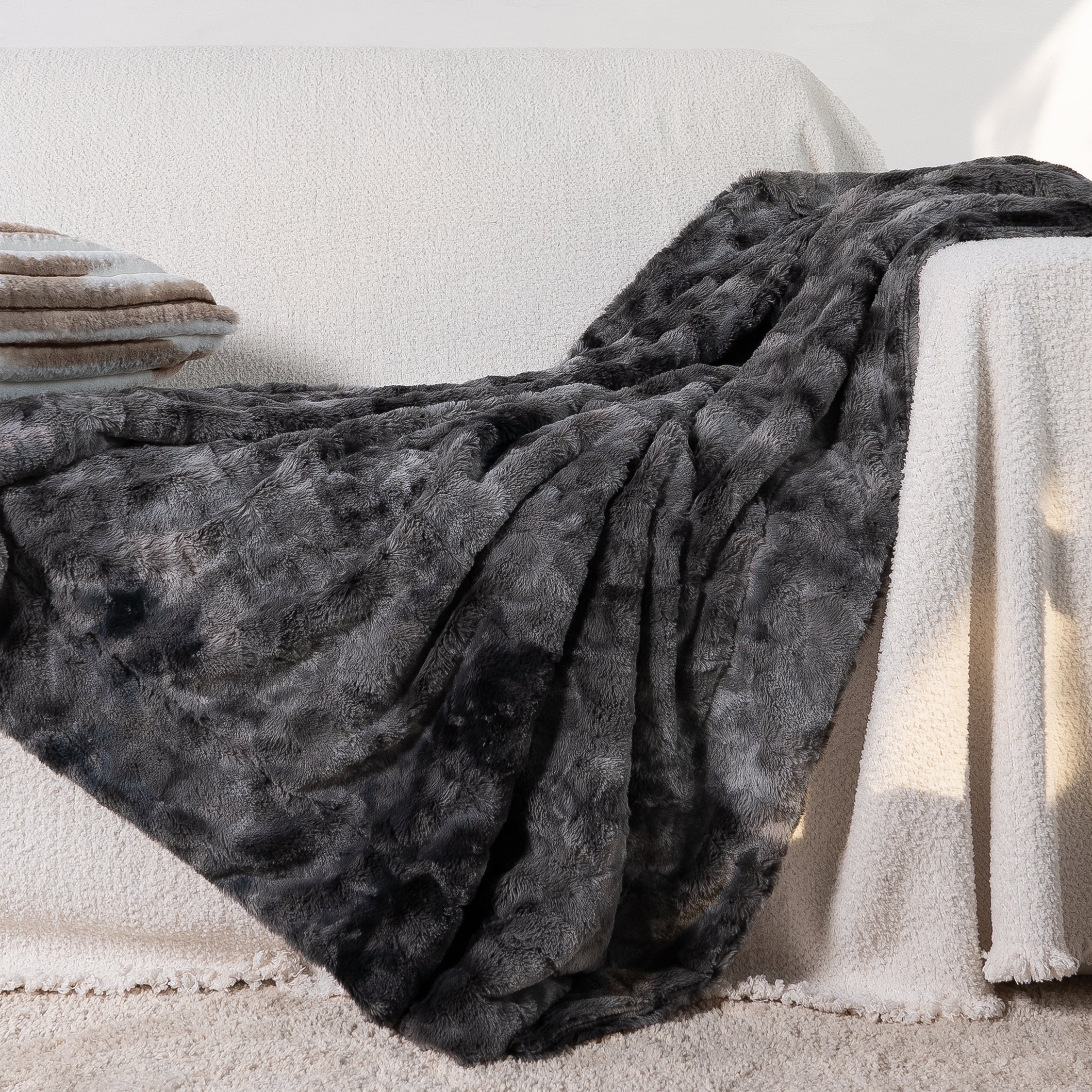 Denna dubbelsidiga filt är designad med plyschig, lurvig fuskpäls på ena sidan och extremt mjuk sherpa på den andra, och erbjuder extremt mysig komfort för en elegant upplevelse året runt. Den dubbelsidiga fuskpälsfilten upprätthåller en idealisk balans mellan vikt och värme, perfekt för att gosa hemma, på resor, campingturer eller var som helst däremellan. Njut av den mjuka och lugnande omfamningen av denna filt när du är redo att mysa. Det är den perfekta ultramjuka presenten till kvinnor, män, barn och till och med dina husdjur.