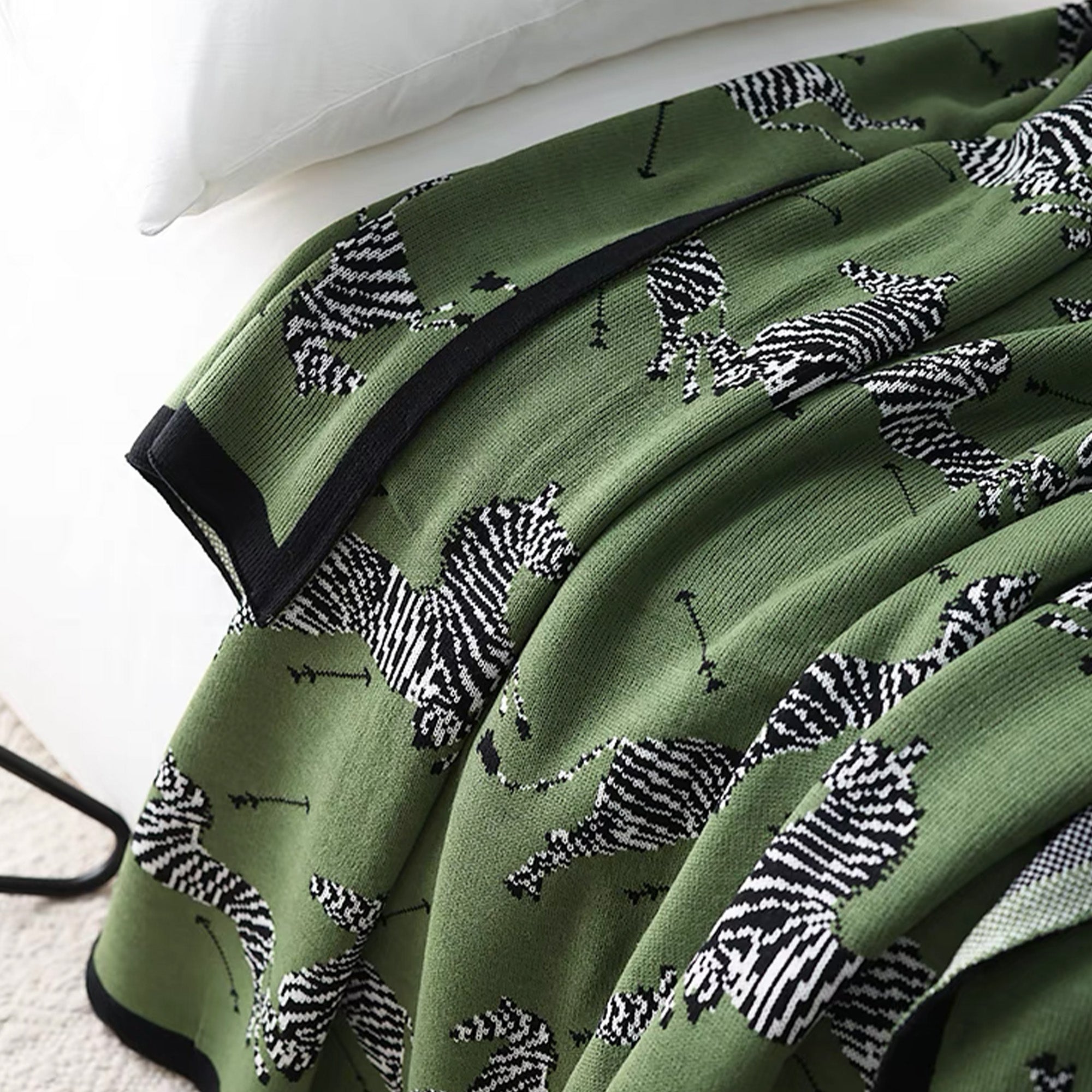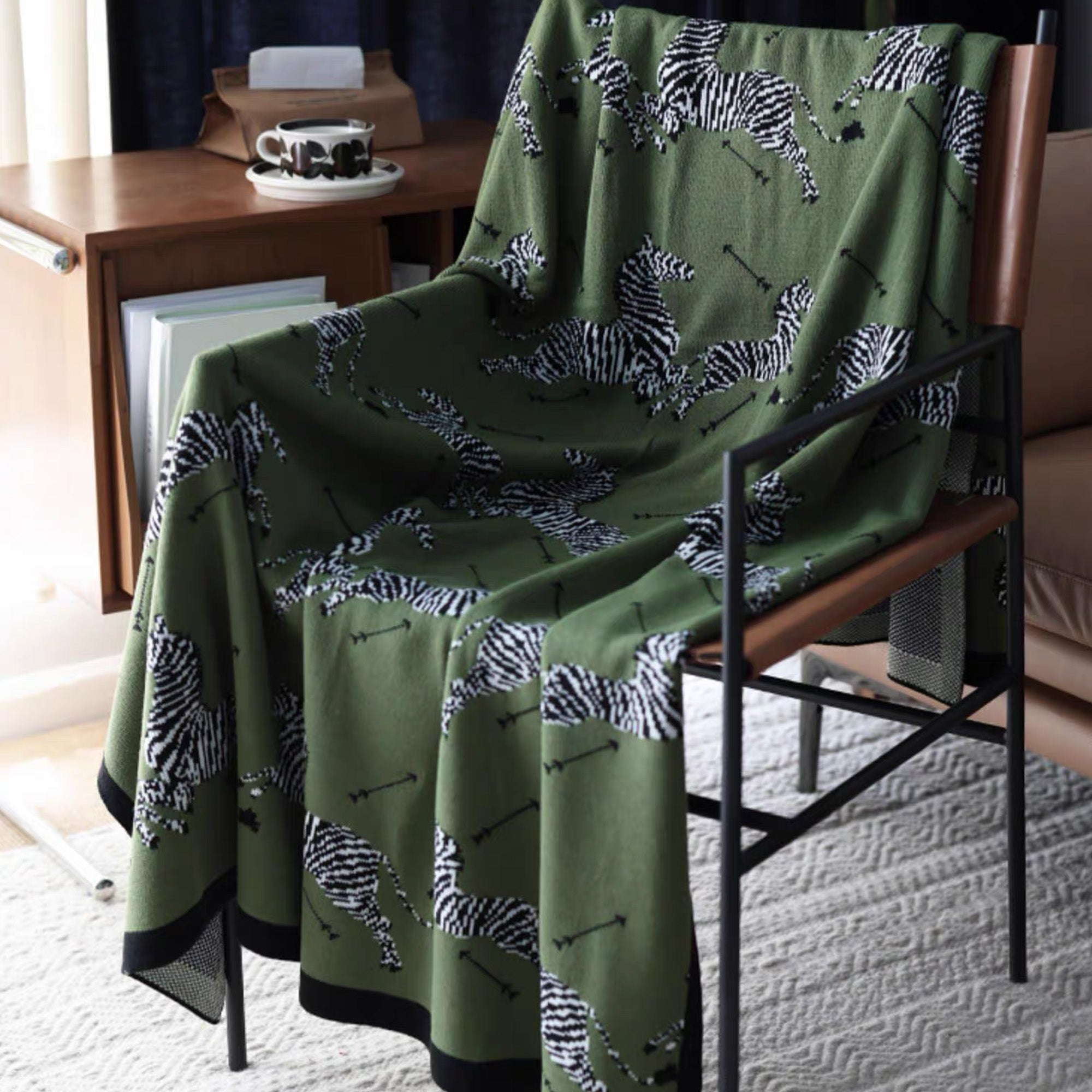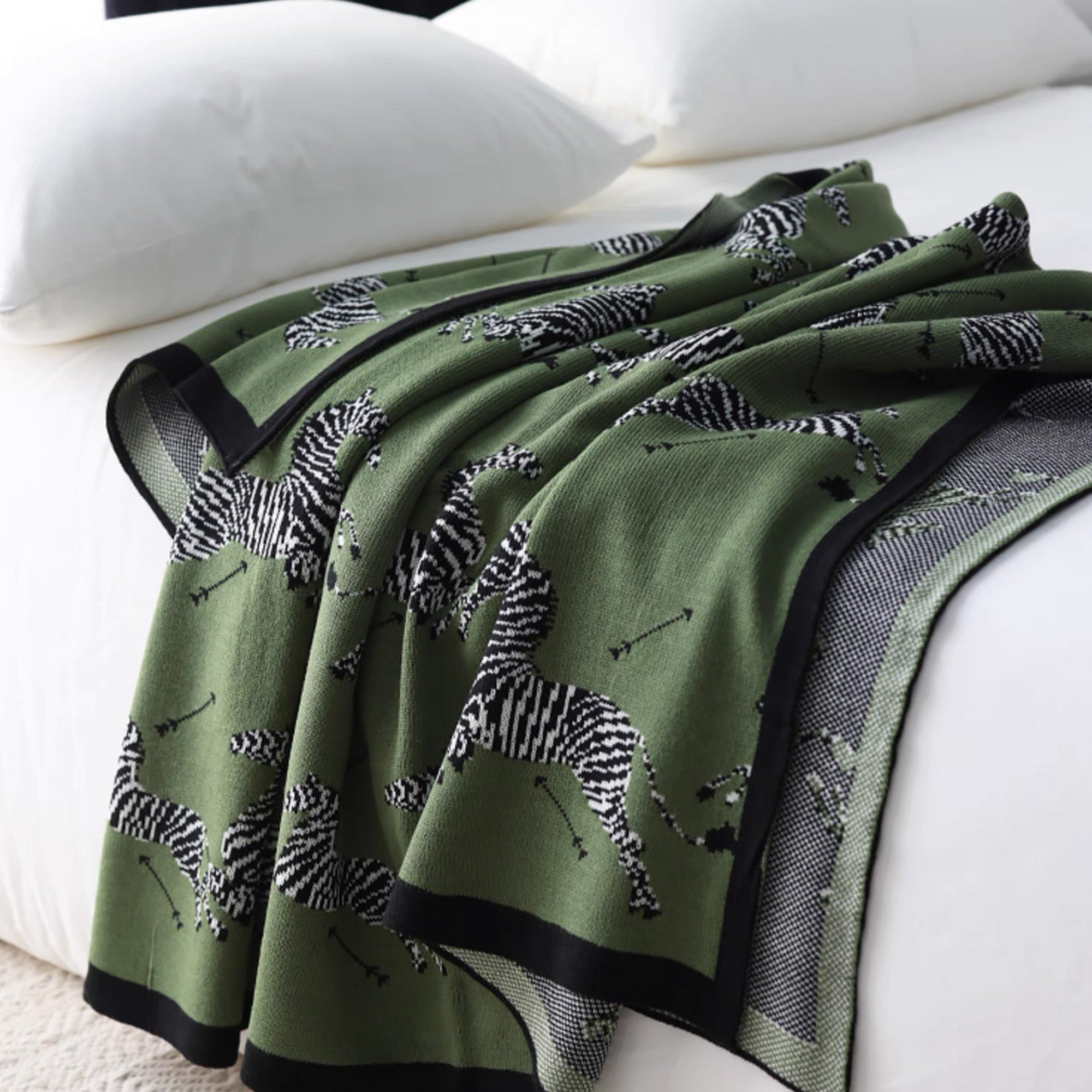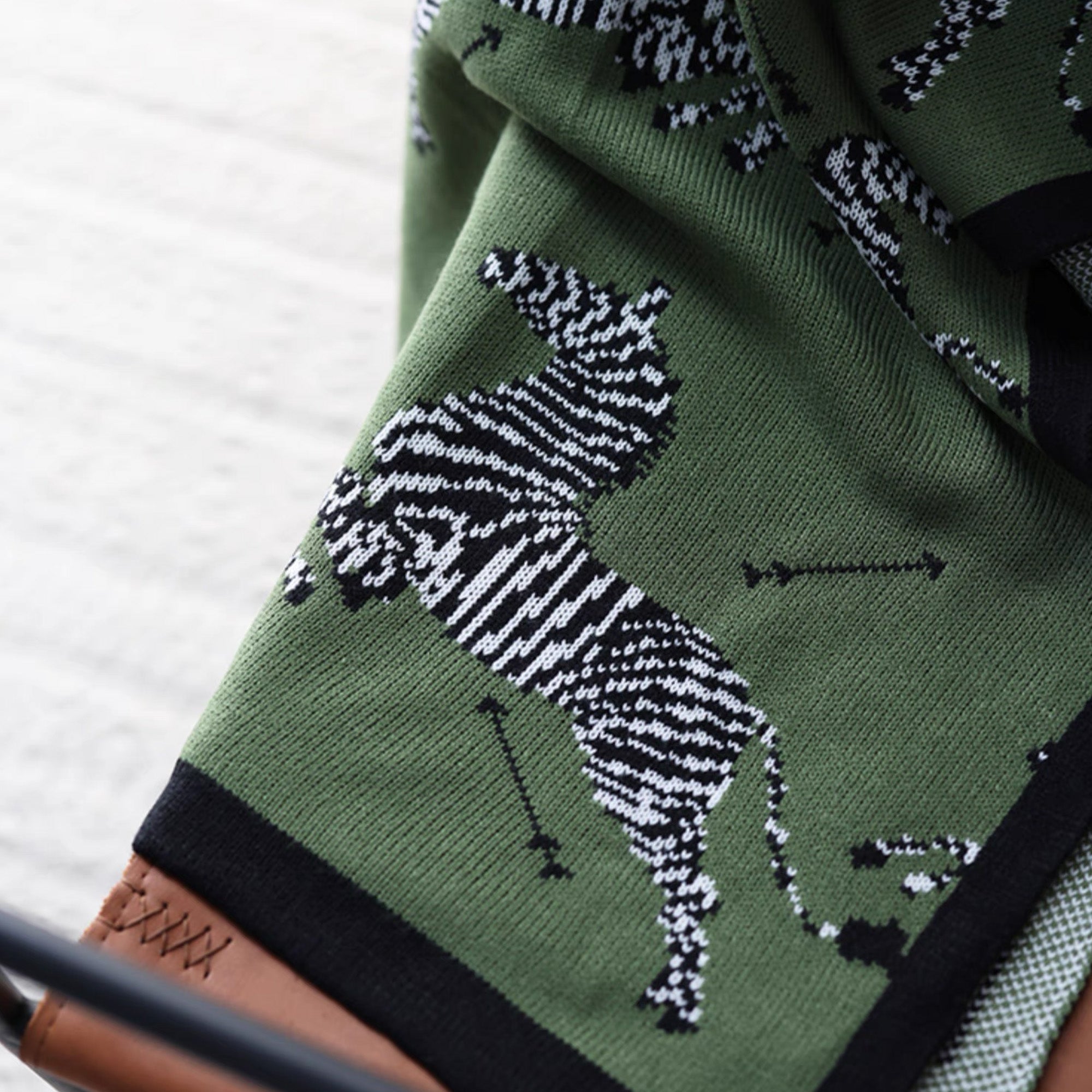 Ge ditt hem en touch av vild elegans med vår Zebra Safari-filt. Med ett lekfullt zebramönster mot en frodig grön bakgrund är denna filt perfekt för att ge en unik, äventyrlig känsla till vilket utrymme som helst. Det mjuka stickade materialet garanterar värme och komfort, medan den djärva designen gör den till en iögonfallande accent för soffor, fåtöljer eller sängar.