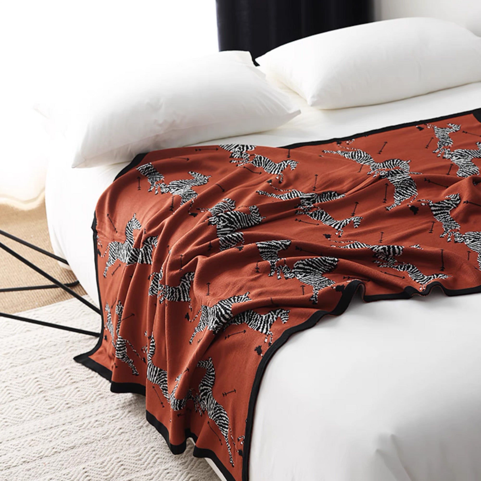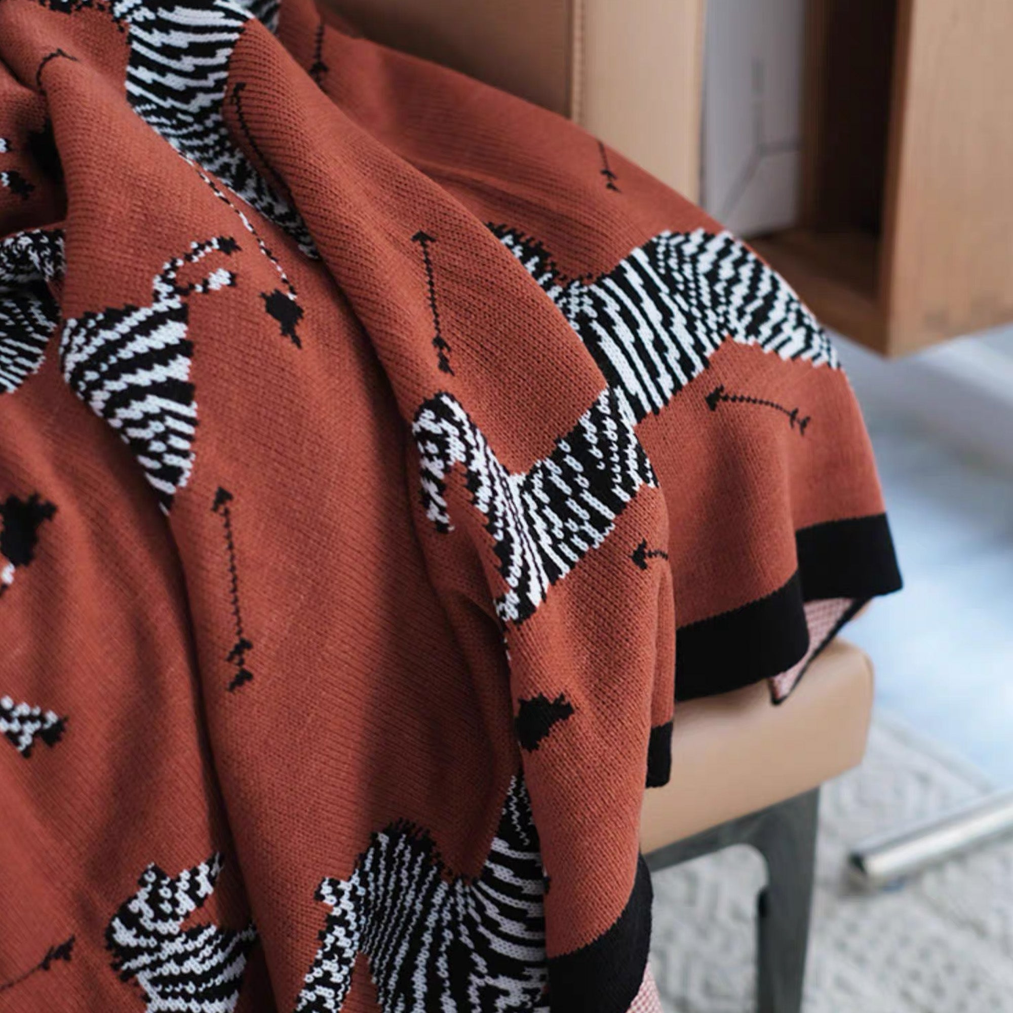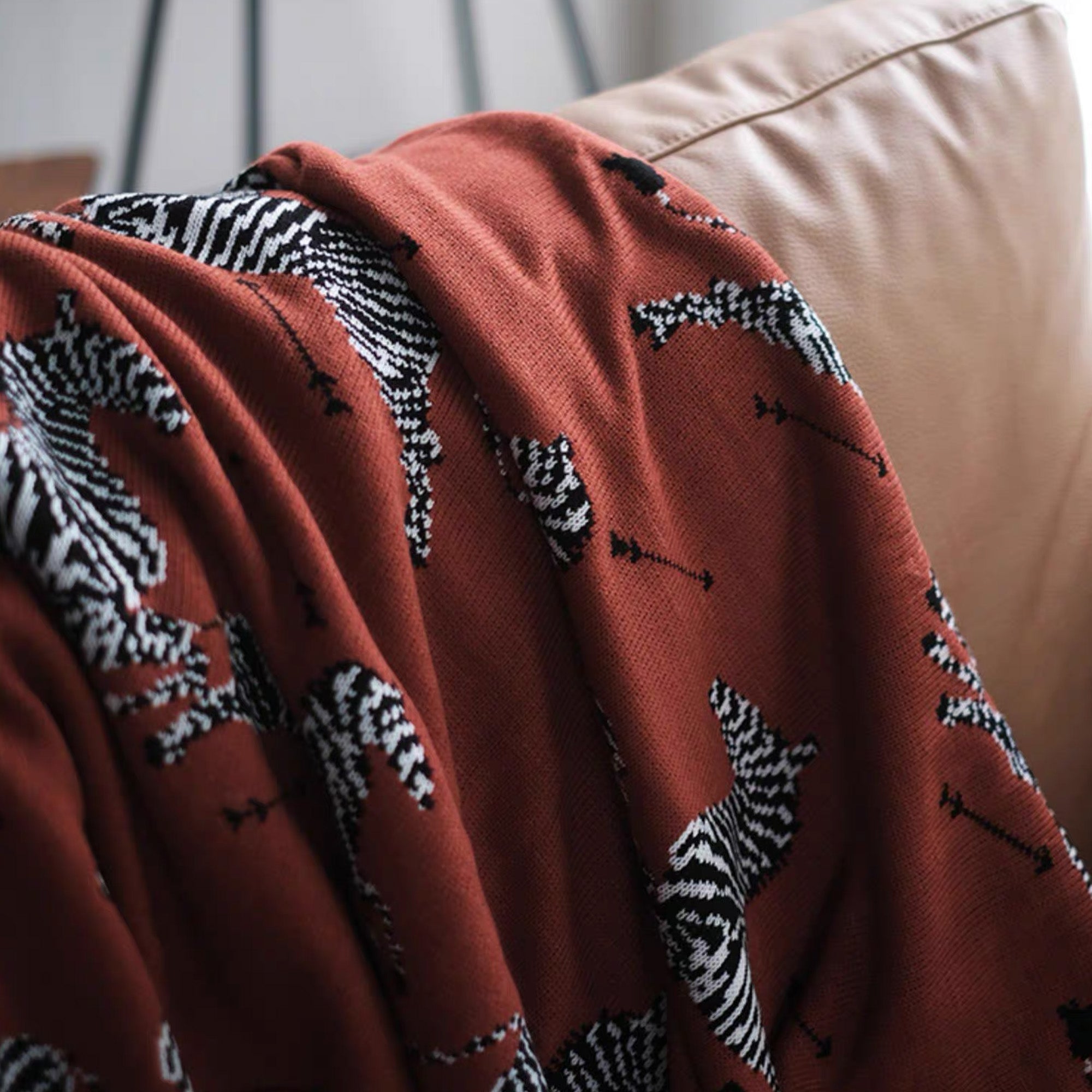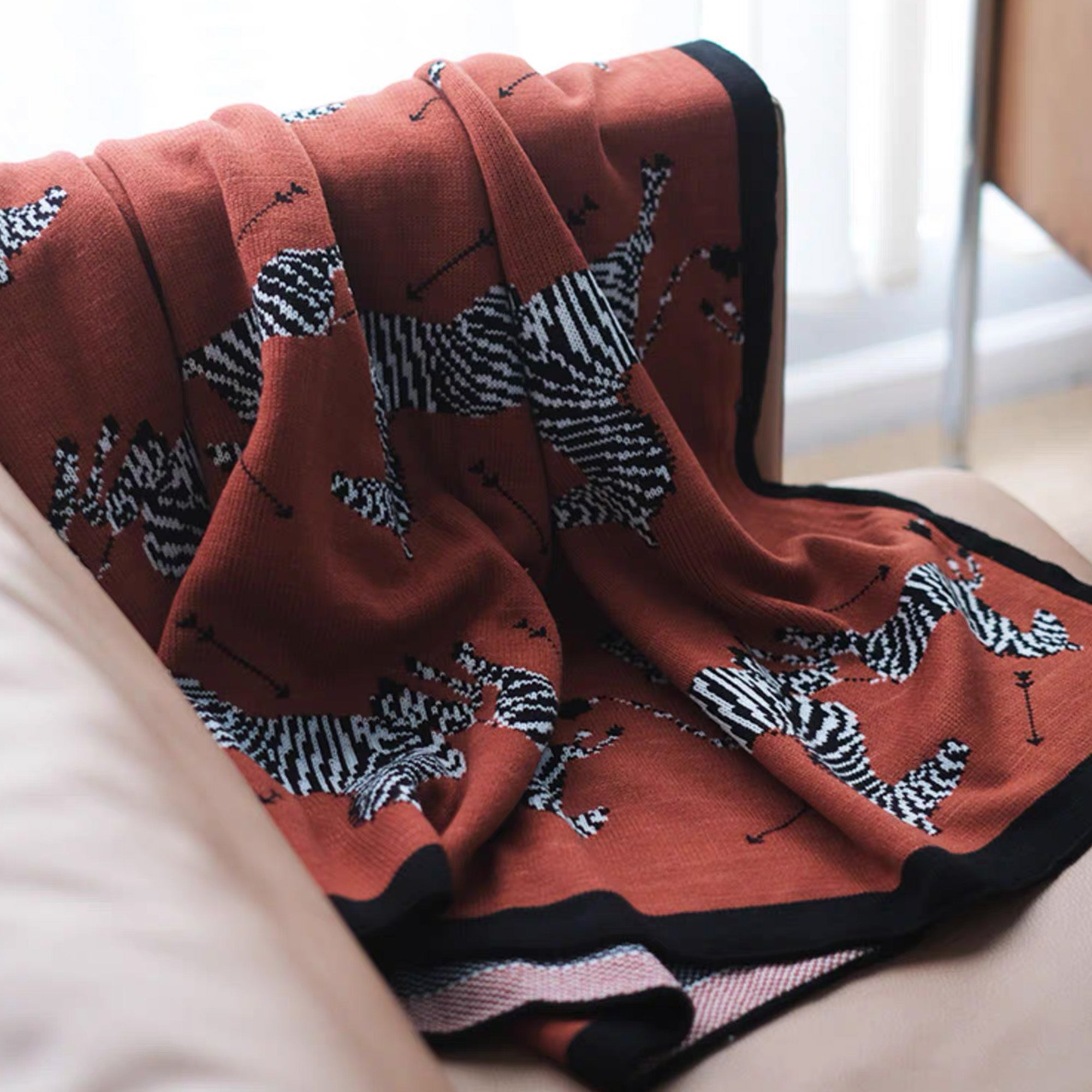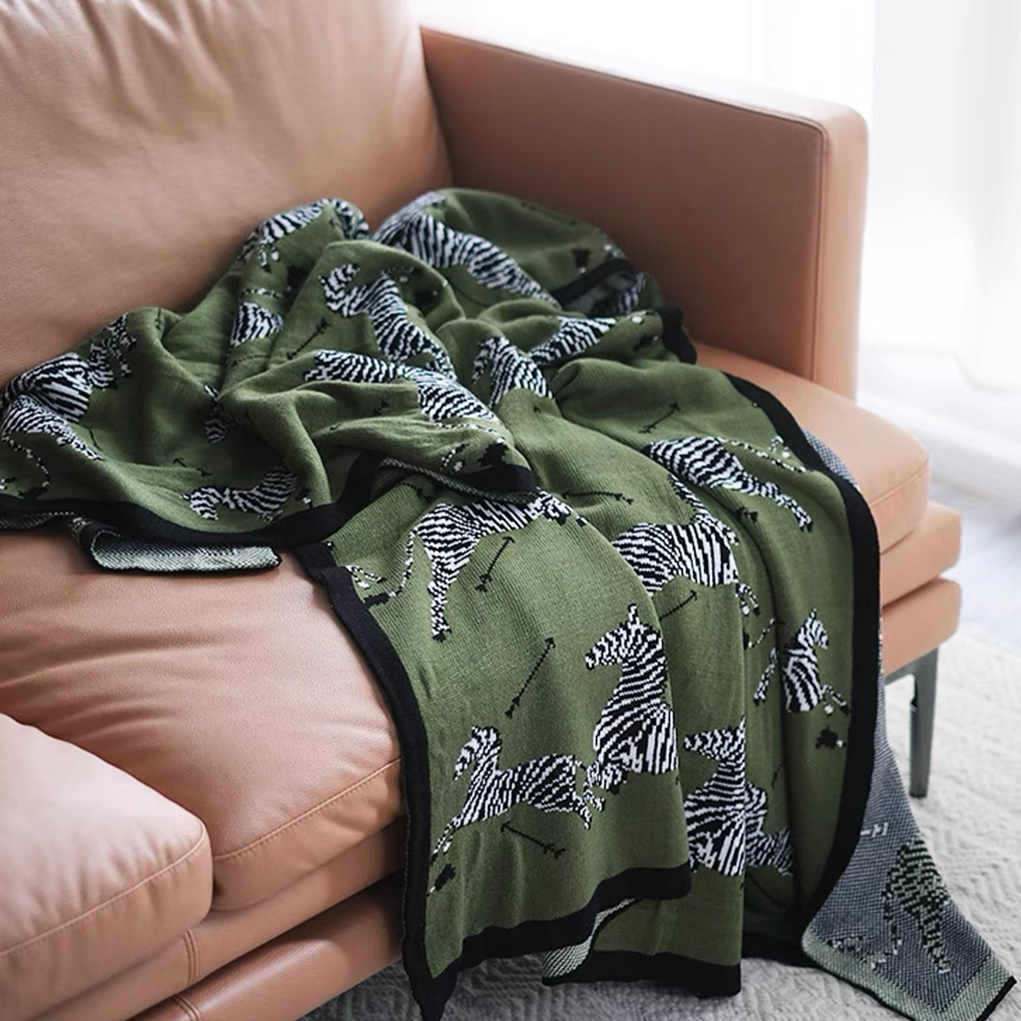 Ge ditt hem en touch av vild elegans med vår Zebra Safari-filt. Med ett lekfullt zebramönster mot en frodig grön bakgrund är denna filt perfekt för att ge en unik, äventyrlig känsla till vilket utrymme som helst. Det mjuka stickade materialet garanterar värme och komfort, medan den djärva designen gör den till en iögonfallande accent för soffor, fåtöljer eller sängar.