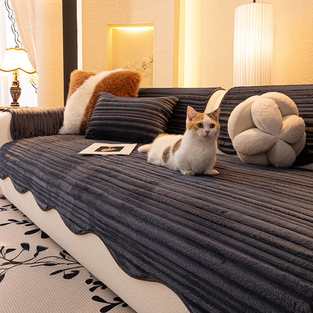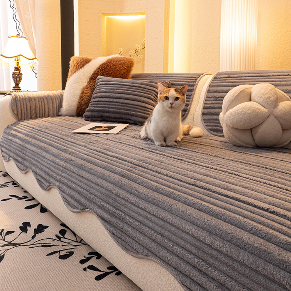 Krämigt ribbat plyschigt halkfritt sofföverdrag