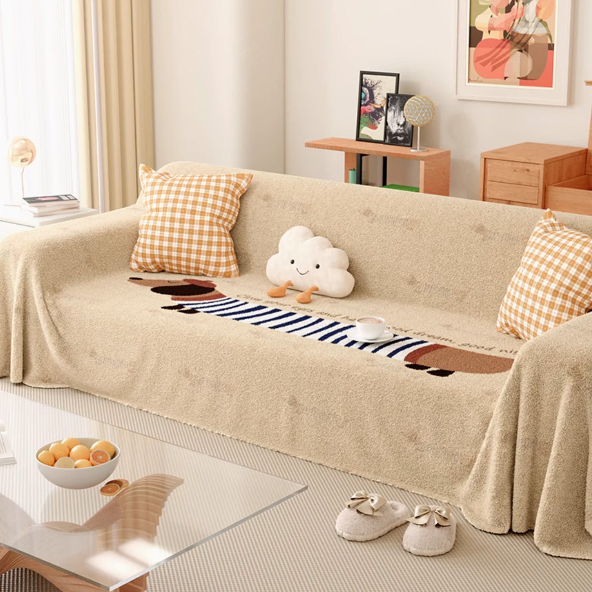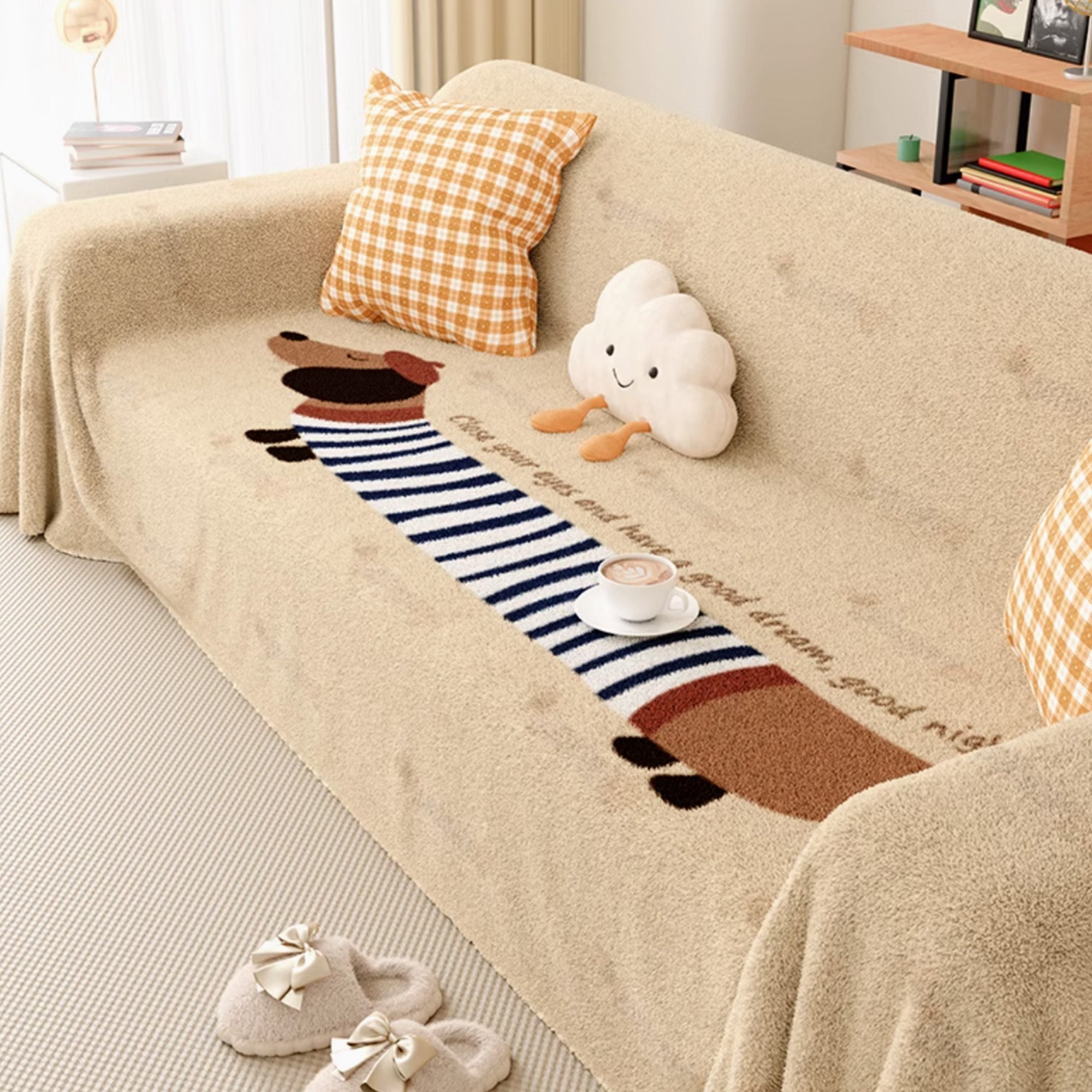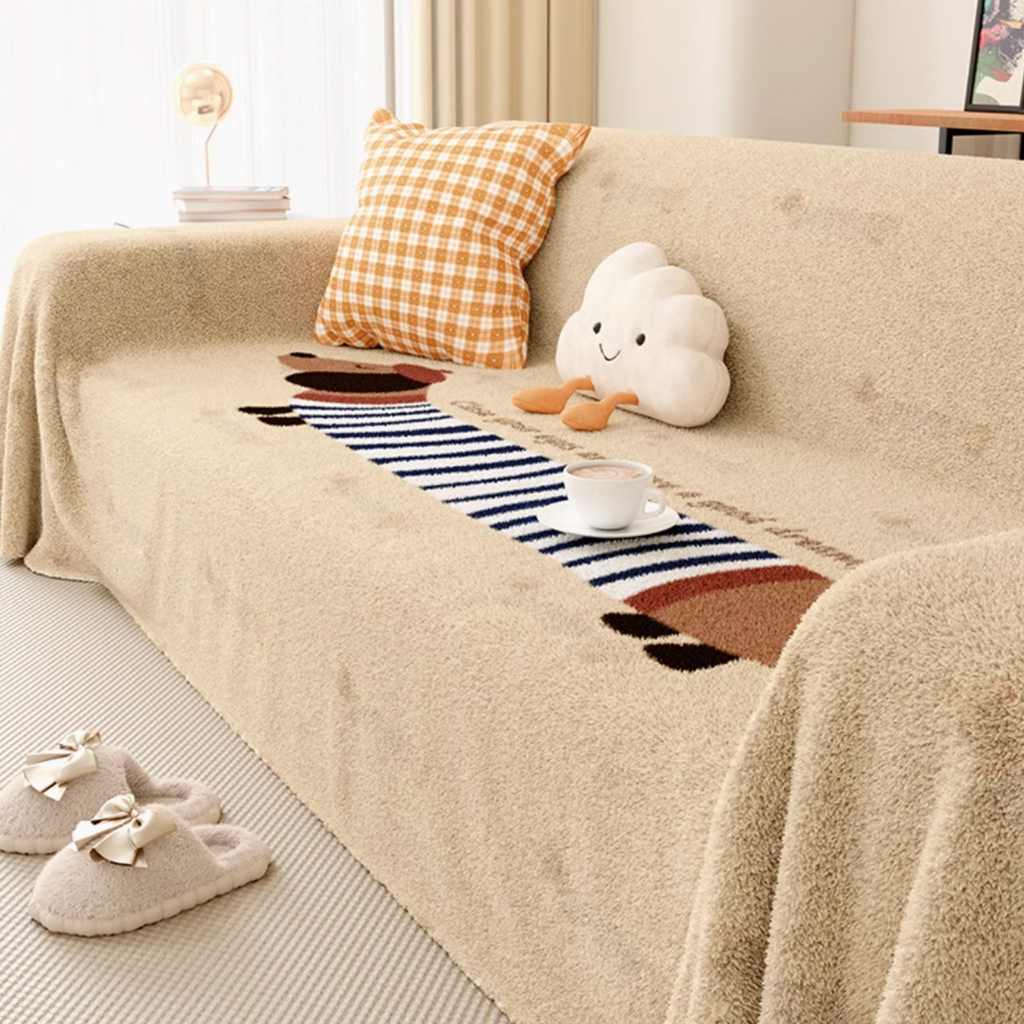 Sofföverdraget med hundtryck i lammull är en perfekt blandning av komfort, värme och lekfull design, vilket gör det idealiskt för djurälskare som vill ge sina hem en mysig och unik touch. Tillverkat av mjuk lammull kombinerar detta sofföverdrag lyxig textur med ett roligt, personligt mönster som visar din kärlek till hundar.